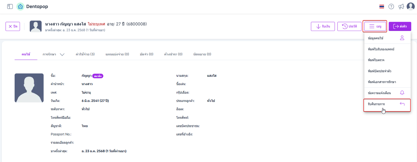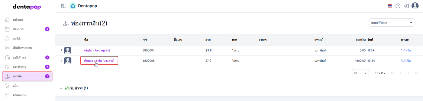 ผู้ใช้งานคลิก เมนูการเงิน เเละคลิกชื่อคนไข้ที่ต้องการคืนสินค้า