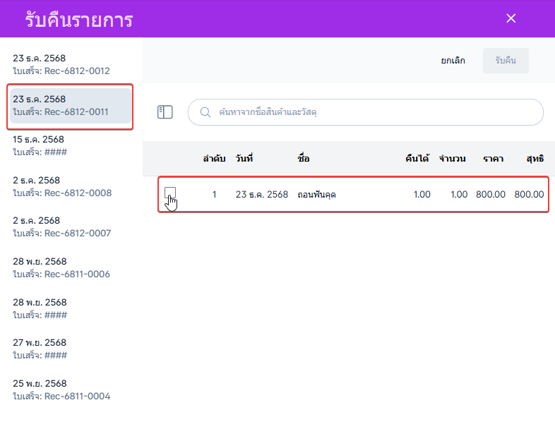เมื่อผู้ใช้งานติ๊กเลือกรายการที่ต้องการคืนเสร็จสิ้น ผู้ใช้งานคลิก รับคืน เพื่อบันทึกการคืนสินค้า