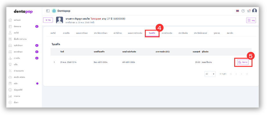 4.ผู้ใช้งานไปที่แถบเมนู ใบเสร็จ