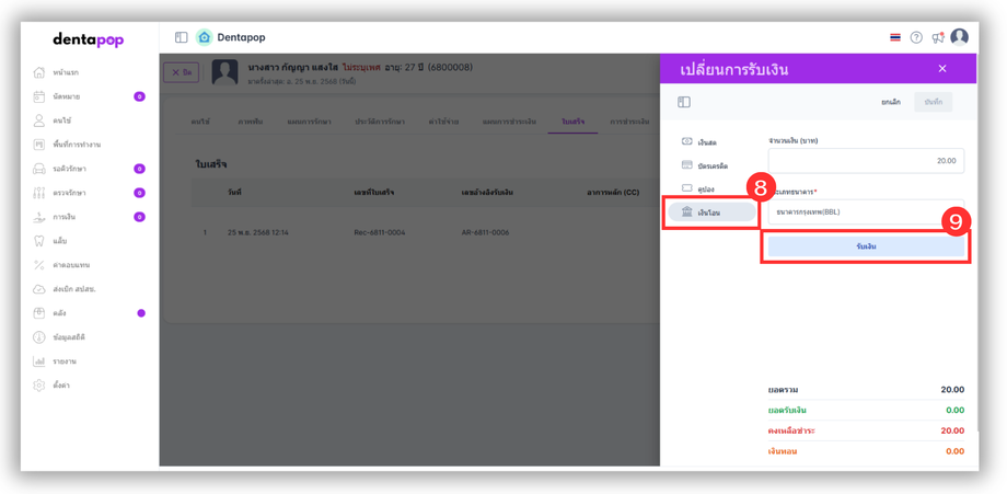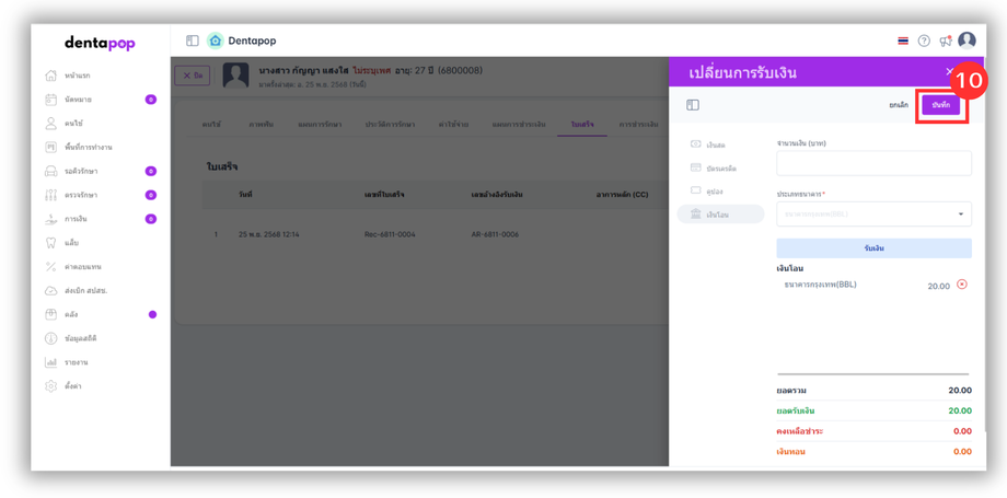 10.ผู้ใช้งานกดบันทึกเพื่อยืนยันการเปลี่ยนแปลงการชำระเงินในใบเสร็จ