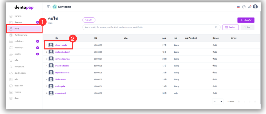 3.ผู้ใช้งานเลือกคนไข้ที่ต้องการเเละเลือกประวัติ