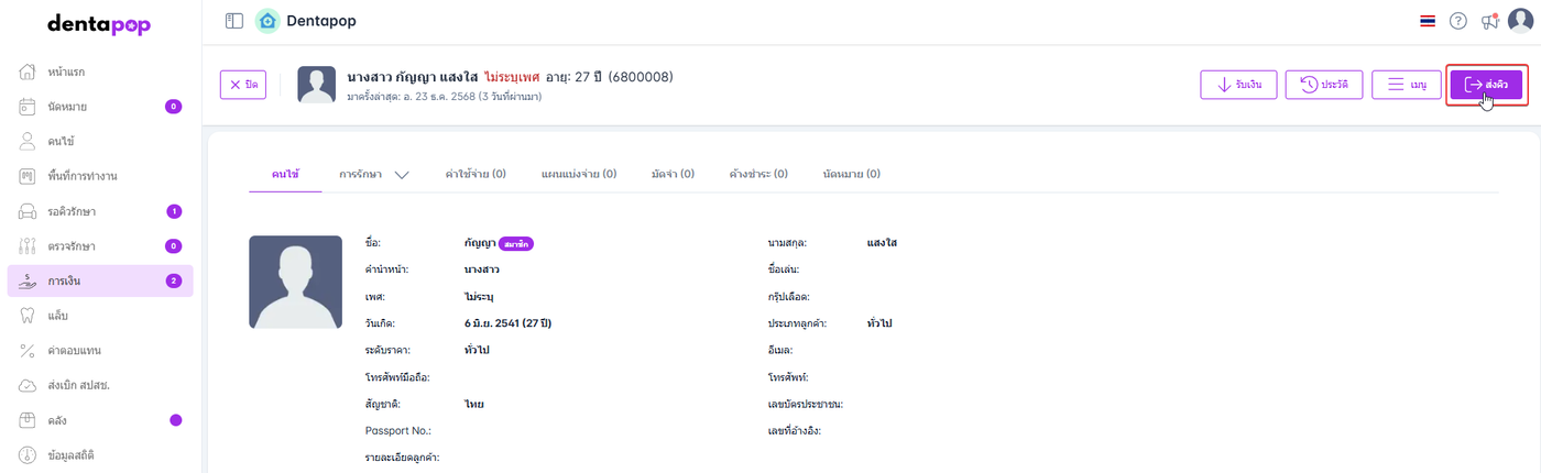 ส่งคิว : ระบบจะบันทึกข้อมูลและส่งชื่อคนไข้เข้าคิวเมนูที่ผู้ใช้งานเลือกและผู้ใช้งานต้องตามไปที่ห้องดังกล่าวด้วยตัวเองเพื่อทำการจัดการคนไข้ต่อไป