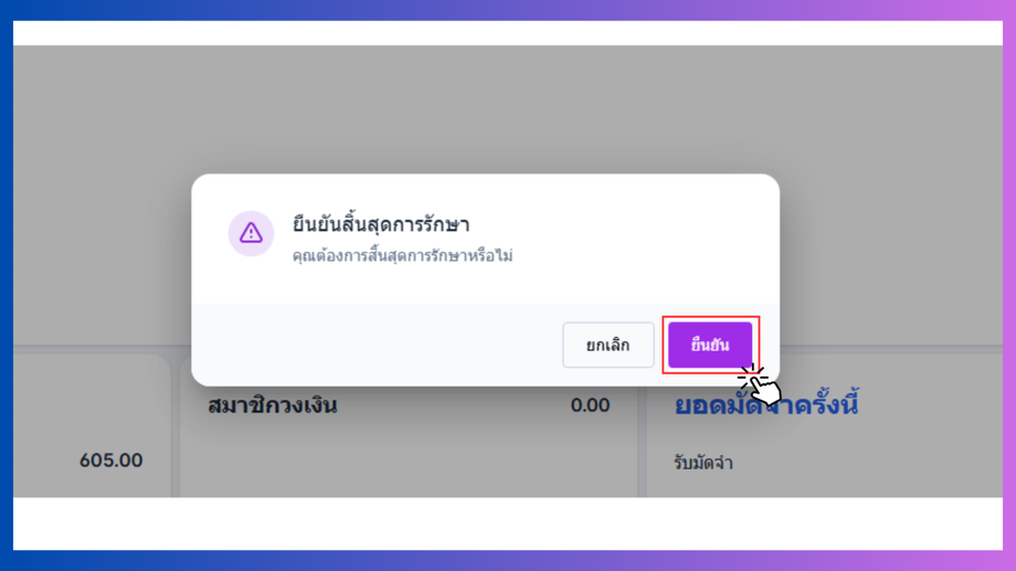 สิทธิการรักษาสปสช สิทธิการรักษา สปสช ทำการสั่งรายการ ห้องการเงิน ใช้สิทธิสปสช.ในการชำระเงินจะถูกหักโดยสิทธิ์ค่าใช้จ่ายจะเป็น 0 บาททันที เมนูการเงิน ค่าใช้จ่าย คลิกที่ส่งเบิกและสิ้นสุดรายการ ยืนยันสิ้นสุดการรักษา เมื่อกดยืนยันแล้วข้อมูลจะถูกส่งไปที่ส่งเบิก สปสช.