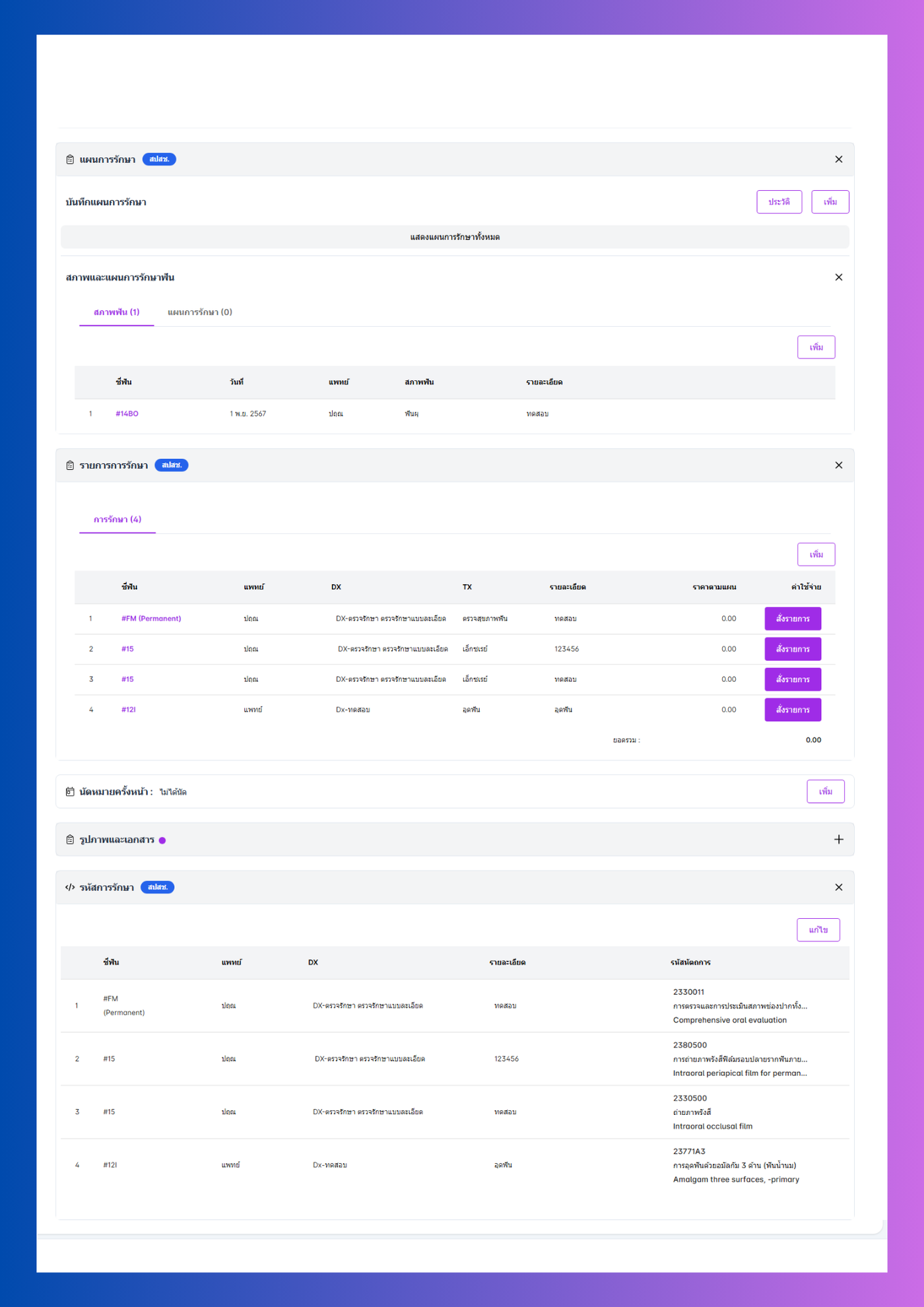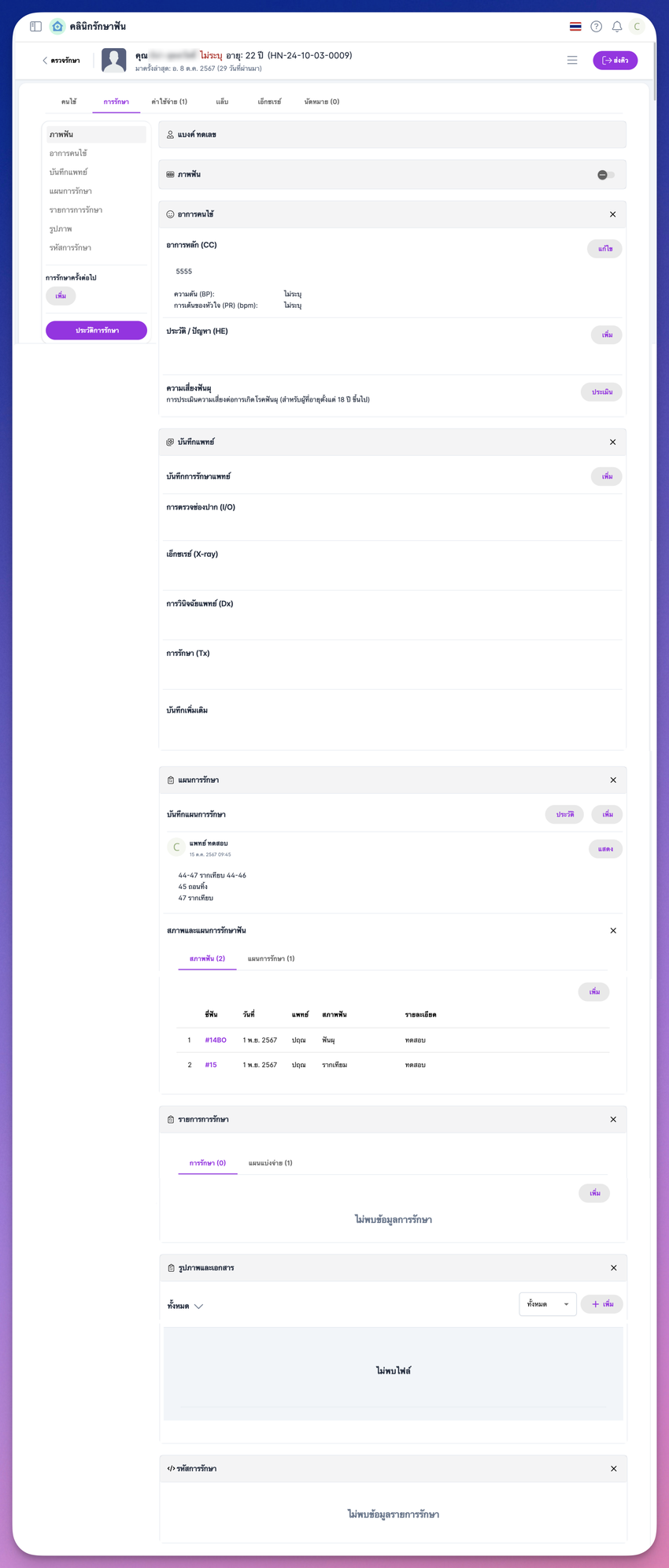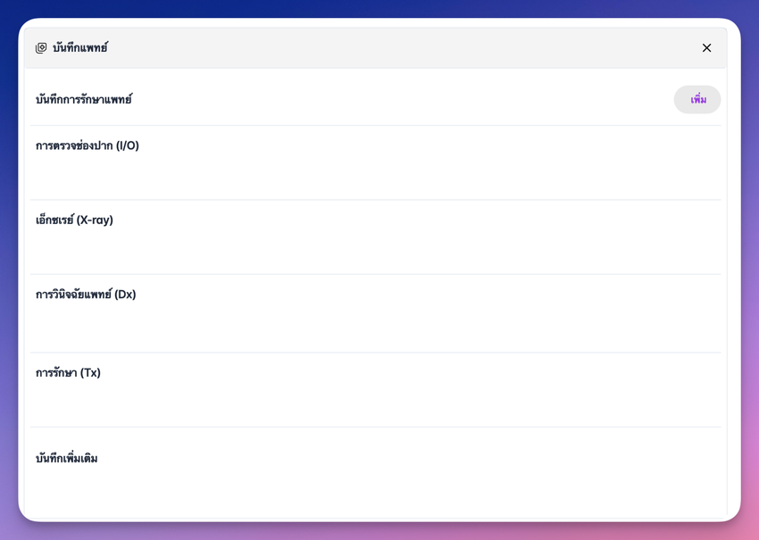 เป็นการบันทึกข้อมูลแพทย์จากการบันทีก ช่องปาก และข้อมูลเอ็กซเรย์ การวินิจฉัย การรักษา และ บันทึกเพิ่มเติม สำหรับการรักษาในครั้งนี้