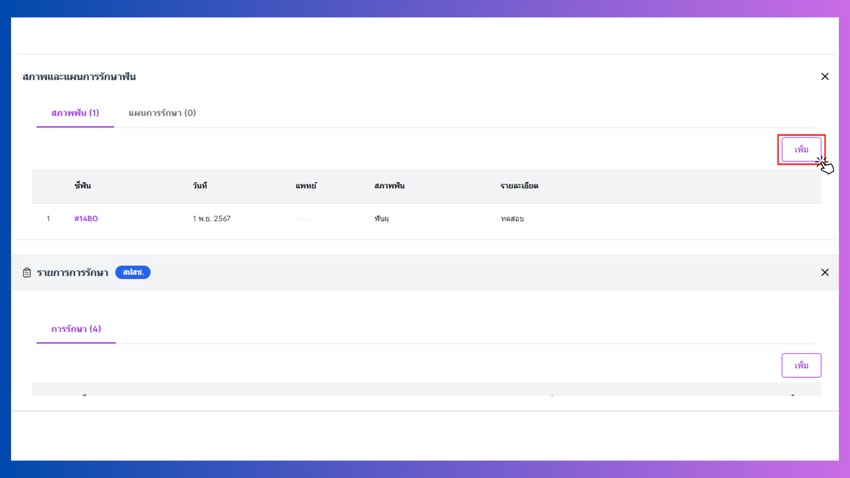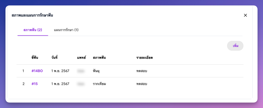 สภาพและแผนการรักษาฟัน แท็บสภาพฟันคลิกที่เพิ่ม