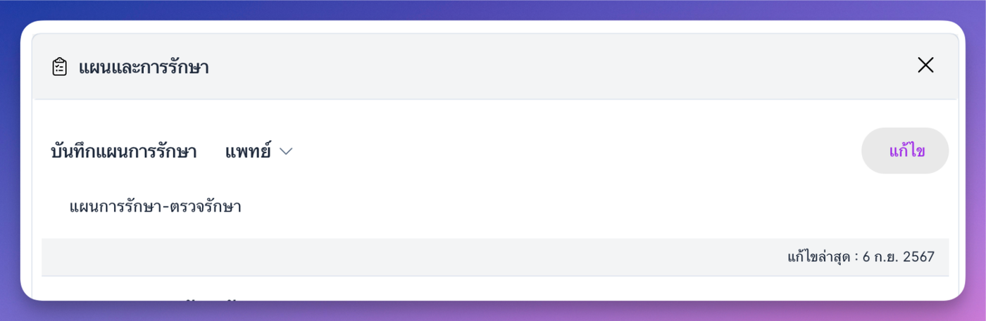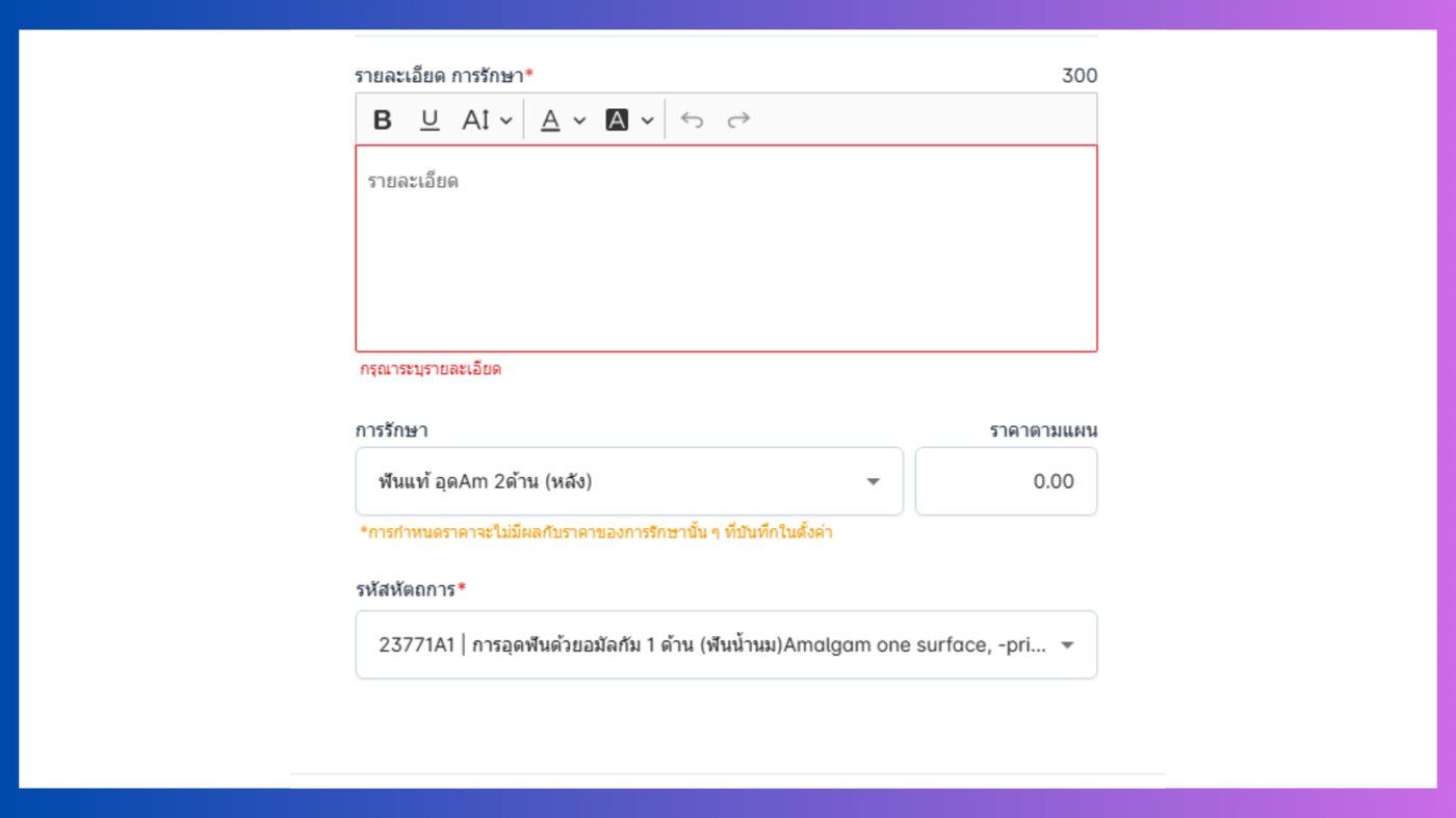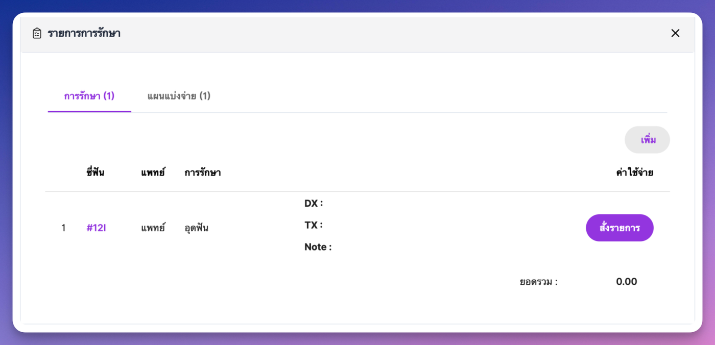 เป็นการบันทึกรายการรักษา จากแผนหรือการบันทึกการรักษาโดยตรงได้ โดยระบุประเภทการรักษา การวินิจฉัย การบันทึกการรักษา และ บันทึกเพิ่มเติม (ถ้ามี) พร้อมทั้งนี้ยังสามารถบันทึกสั่งรายการค่าใช้จ่ายสำหรับคนไข้ได้ทันที