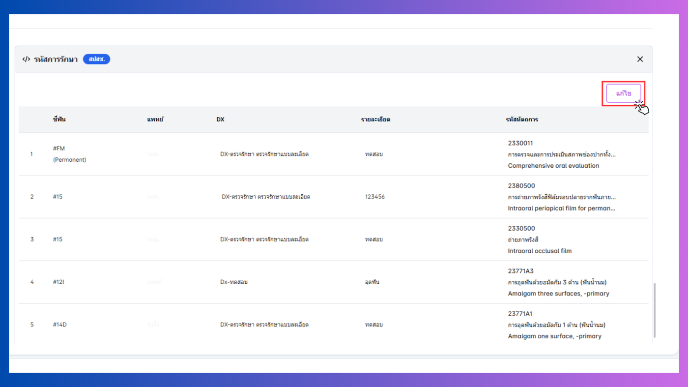 เมื่อทำการการรักษาแล้วข้อมูลการรักษาจะมาแสดงที่รหัสการรักษาและสามารถทำการแก้ไขข้อมูลได้
