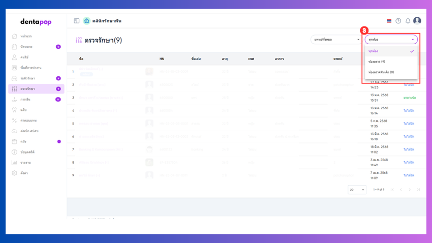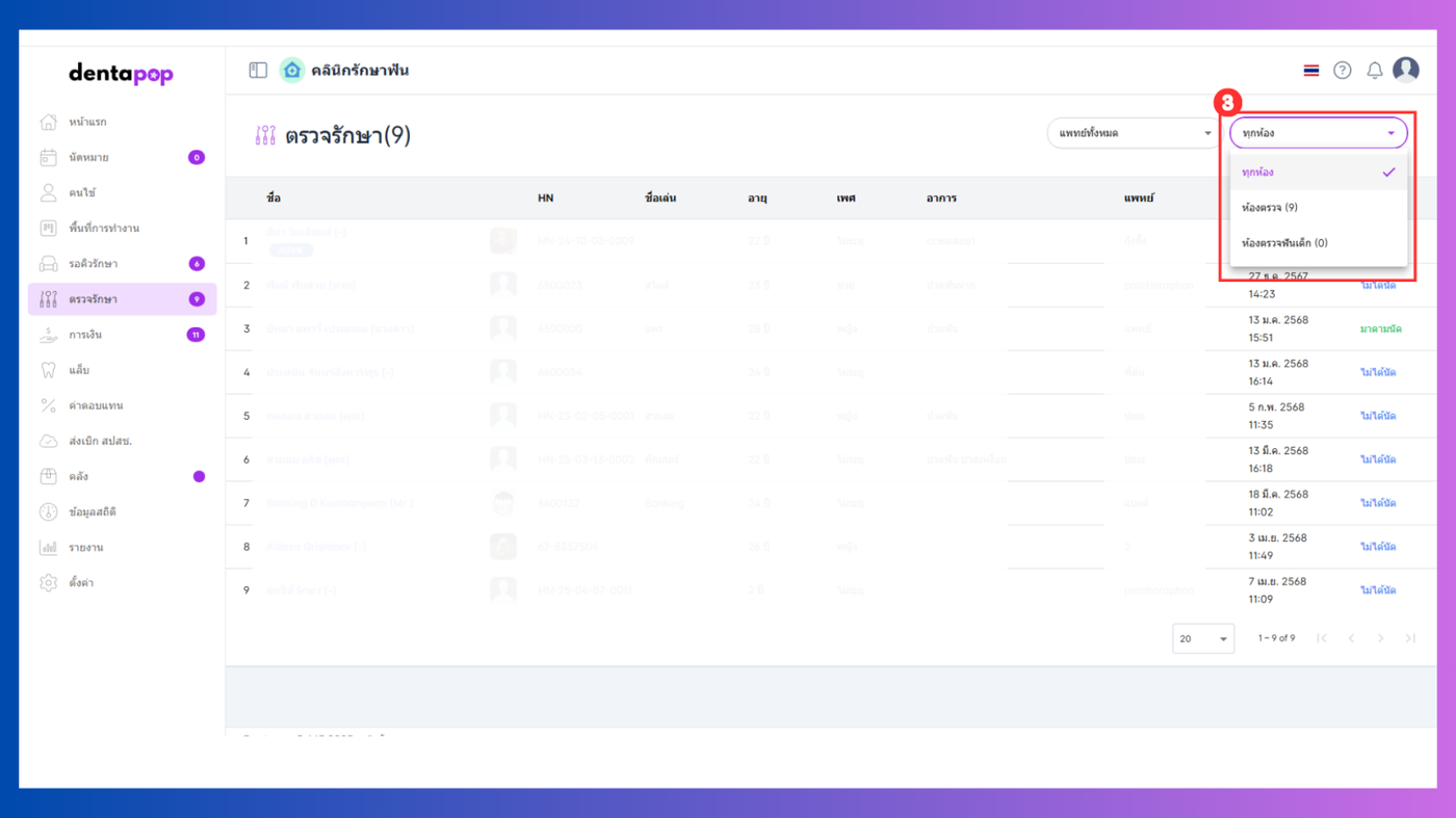 3. จะเข้าสู่หน้าเมนูตรวจรักษา แสดงรายชื่อคนไข้ และห้องตรวจที่คนไข้ใช้บริการอยู่ ผู้ใช้งานสามารถเลือกการแสดงผลเฉพาะห้องโดยการ คลิกเลือกห้องที่ต้องการ