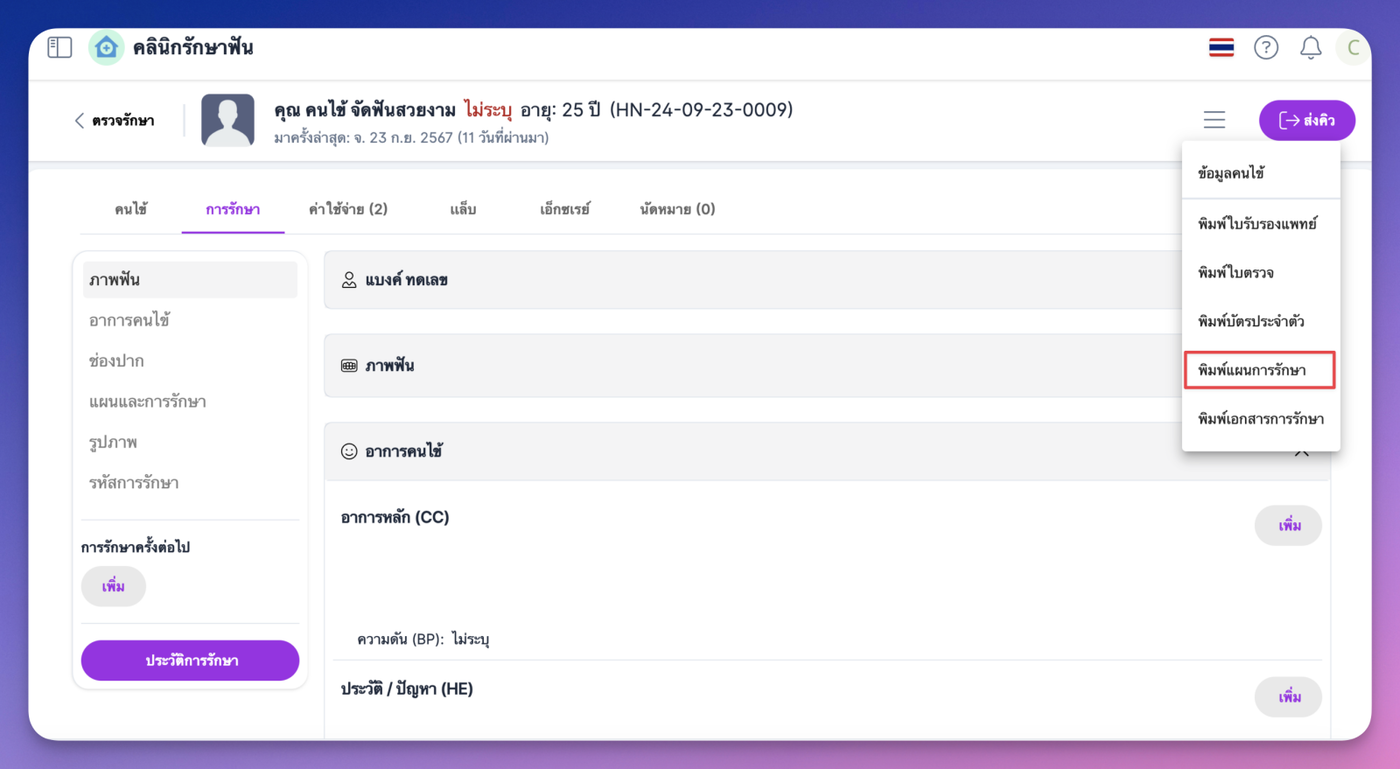 สามารถพิมพ์แผนการรักษา โดยคลินิกสามารถออกแบบแผนการรักษาได้ที่การตั้งค่ารูปแบบเอกสารทางการแพทย์ และสามารถเพิ่มโดยเลือกที่เมนู คนไข้ และพิมพ์แผนการรักษา