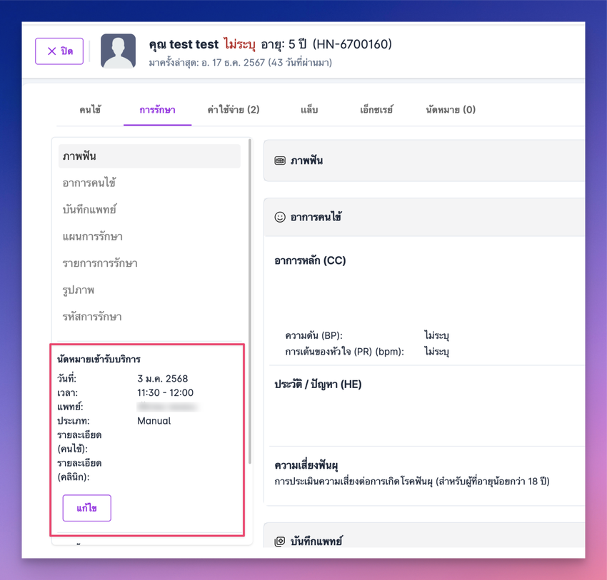 ระบบจะแสดงข้อมูลการนัดหมายในครั้งนี้ที่คนไข้เข้ามารับการรักษาได้ เพื่อให้แพทย์ทราบว่าคนไข้ มีการรักษาจากการนัดหมายใด