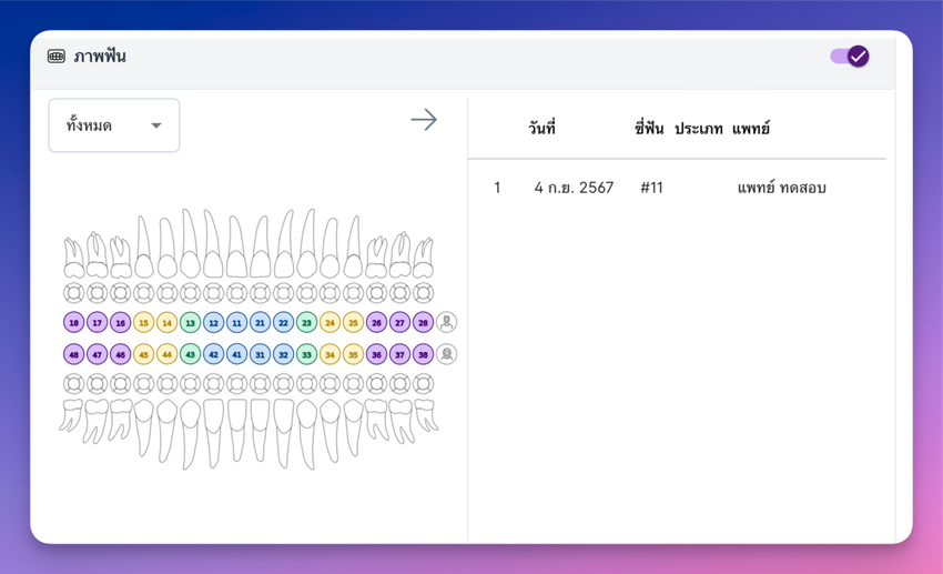 เป็นการแสดงข้อมูลภาพฟันของคนไข้ โดยจะทำการแสดงข้อมูลสำหรับสภาพฟัน และ ฟันที่มีการบันทึกการรักษา โดยระบุผ่านการบันทึกการรักษาโดยแพทย์