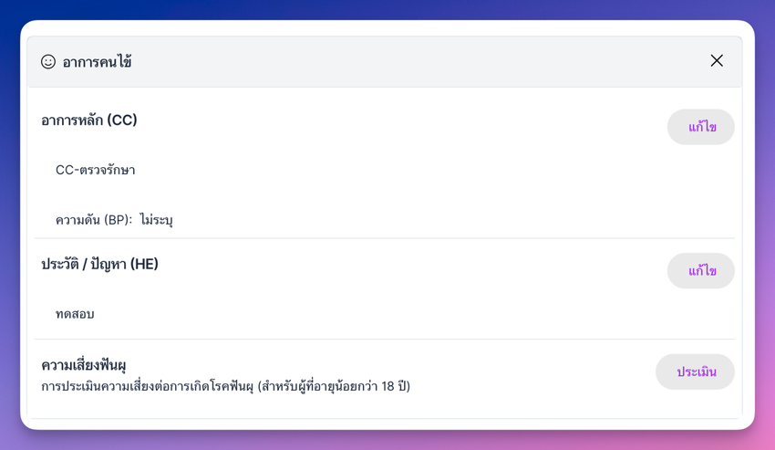 เป็นการบันทึกข้อมูลจากเจ้าหน้าที่หรือ จากแพทย์ที่มีการสอบถามจากคนไข้ โดยการบันทึกอาการหลัก ความดัน ประวัติก่อนมารักษา และ การบันทึกความเสี่ยงฟันพุ