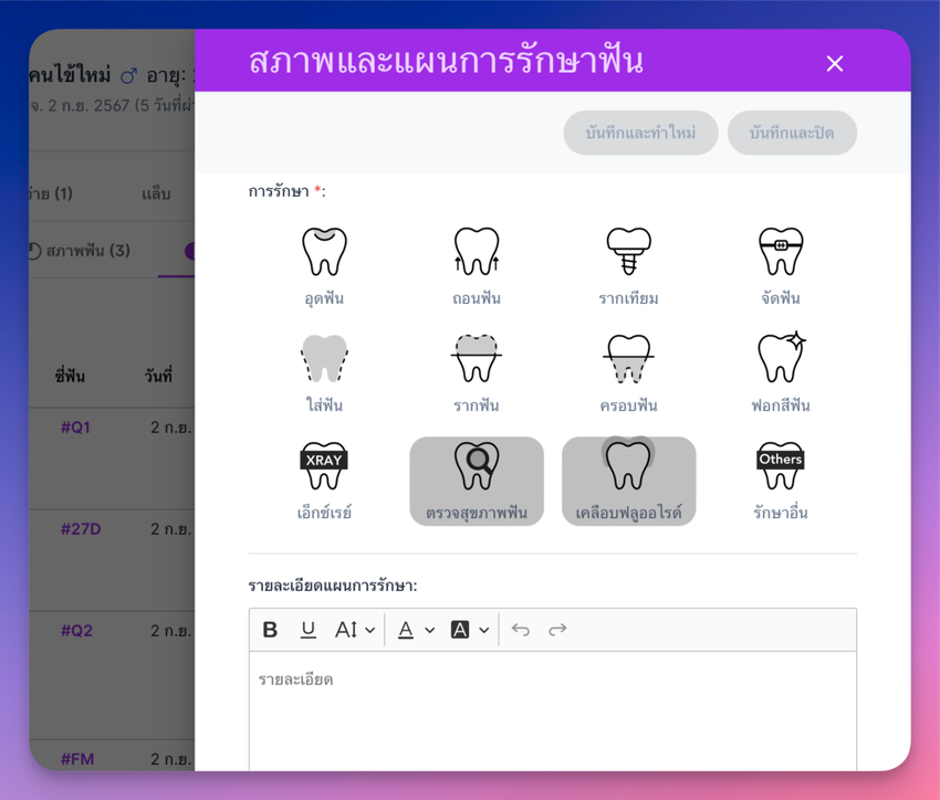 - เมื่อกดบันทึกแล้วจะมีหน้าแผนการรักษาแสดงให้เลือกสภาพฟันและกรอกรายละเอียดสภาพฟัน
