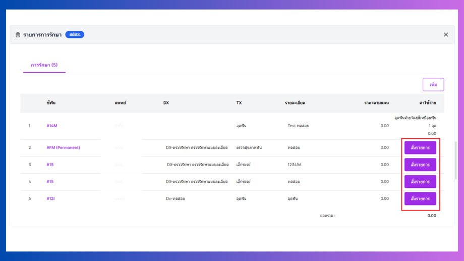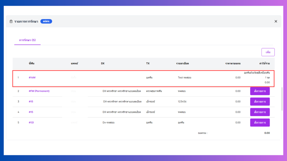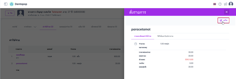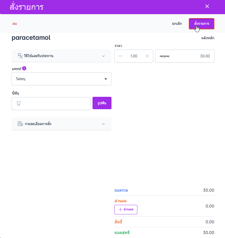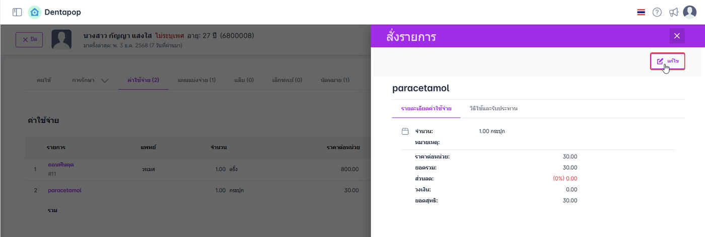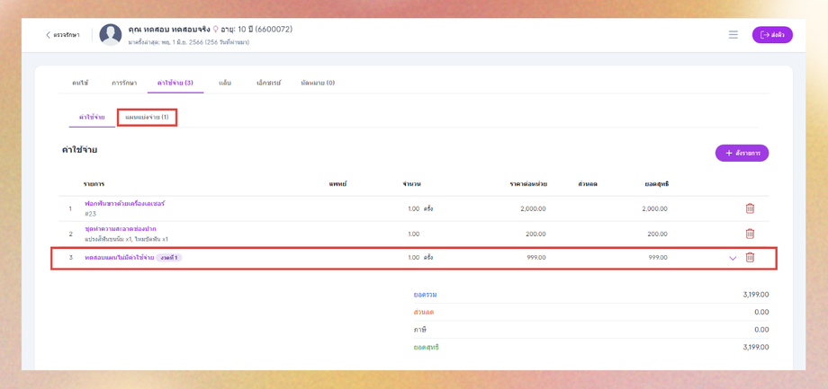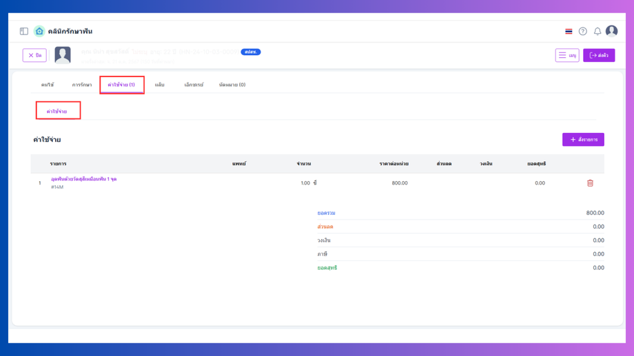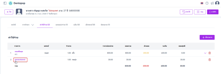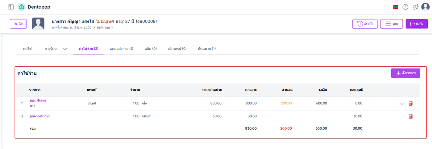 แท็บค่าใช้จ่ายจะแสดงรายการที่สั่ง แพทย์ จำนวน ราคา ยอดสุทธิ และสามารถ ลบ รายการที่สั่งได้