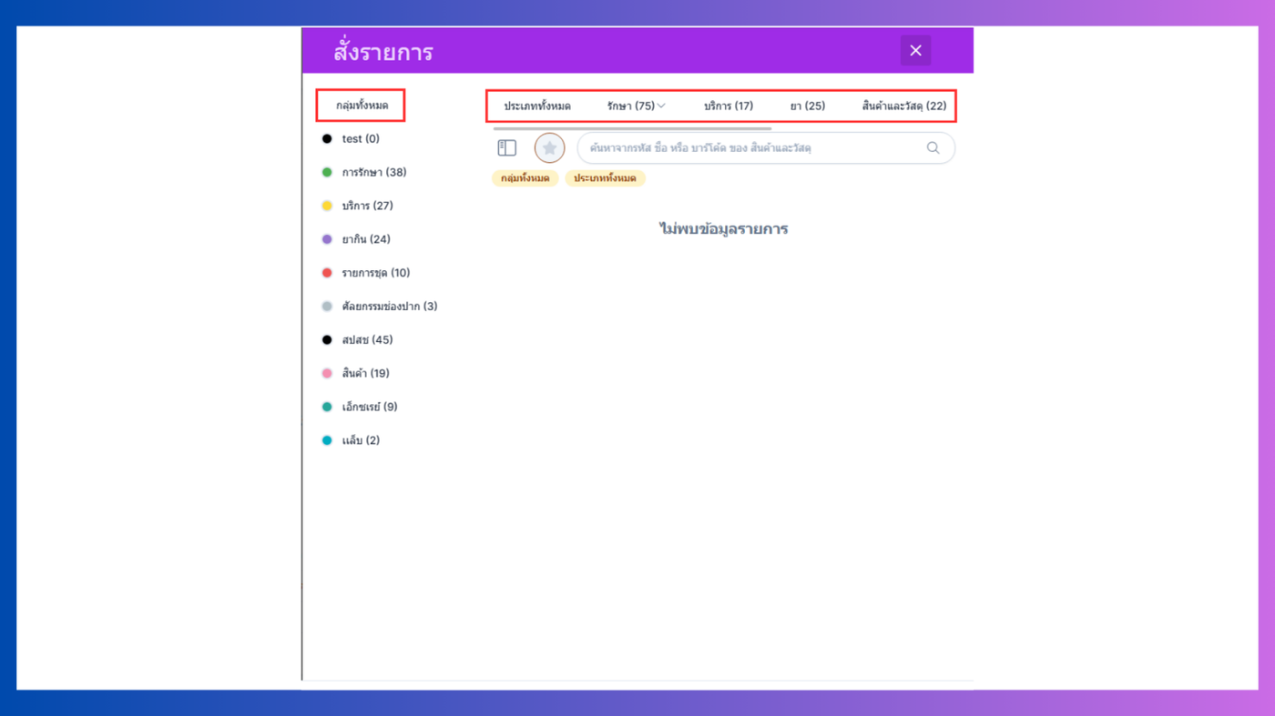 หน้าสั่งรายการ กลุ่มทั้งหมด ประเภทต่างๆ