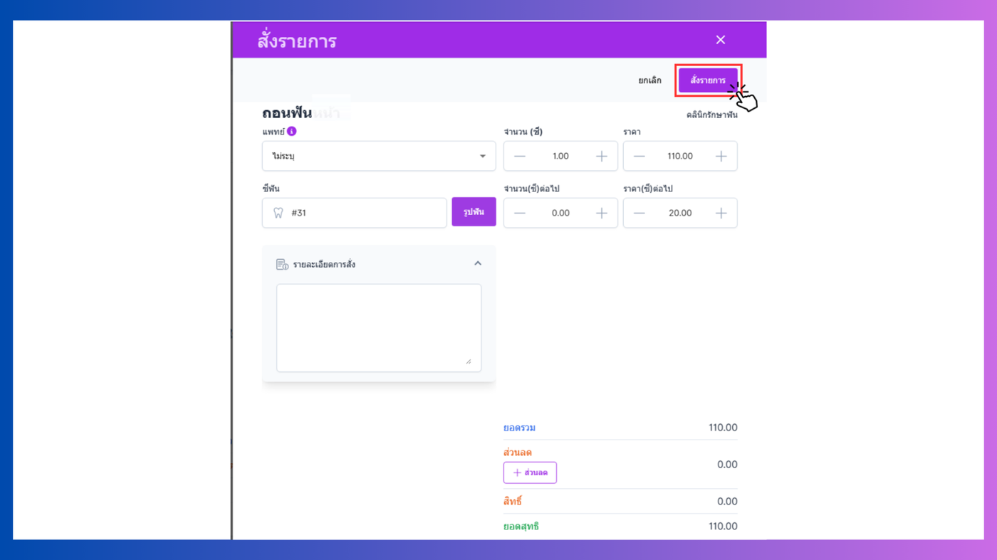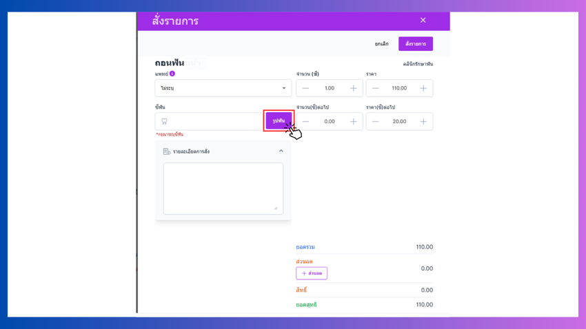 - ผู้ใช้งานสามารถคลิกที่ซี่ฟัน ระบบจะระบุซี่ฟันในกล่องข้อความ