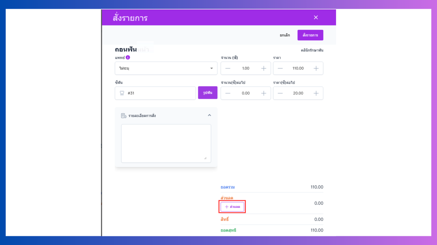 - ส่วนลด : คลิกที่เพิ่มส่วนลด
