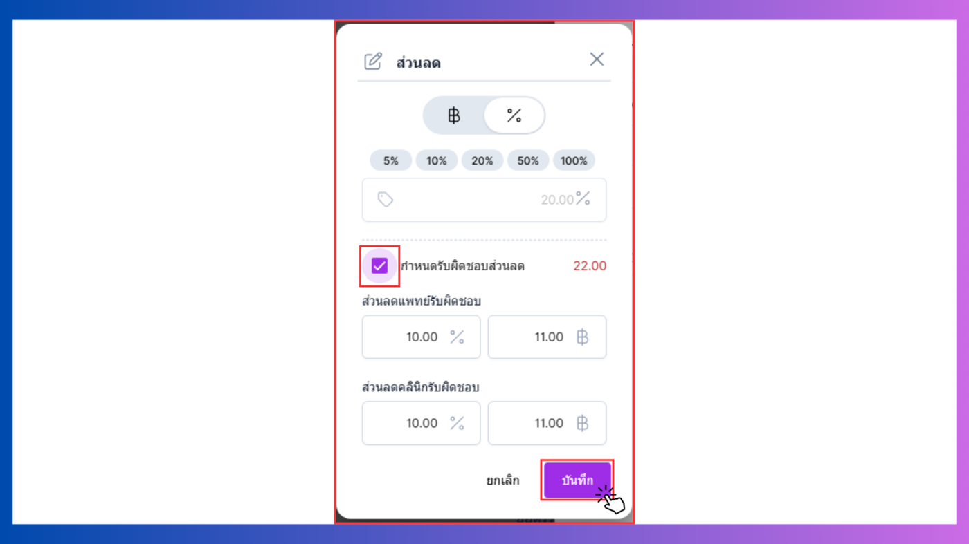 - กำหนดส่วนลด เลือกส่วนลดที่ต้องการ