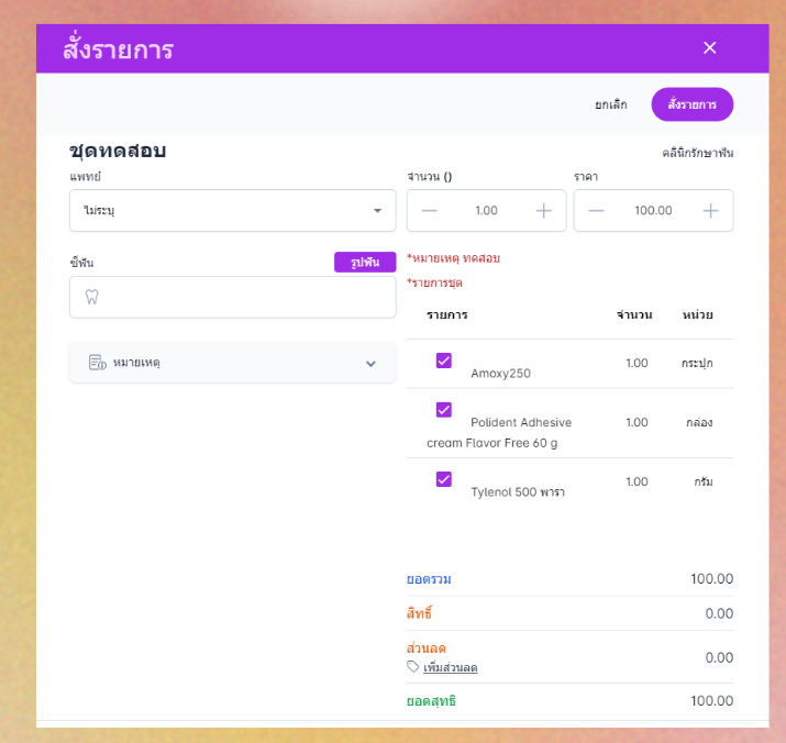 - คลิกที่สั่งรายการ ระบบจะแสดงหน้าต่างสั่งรายการ
