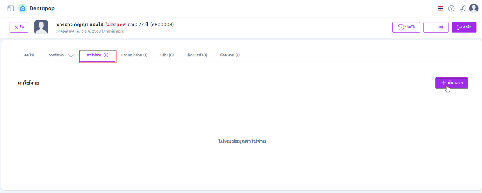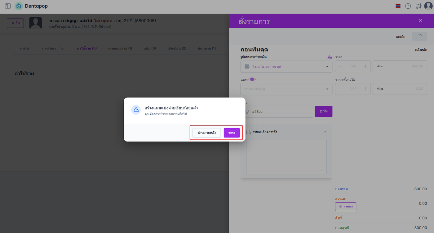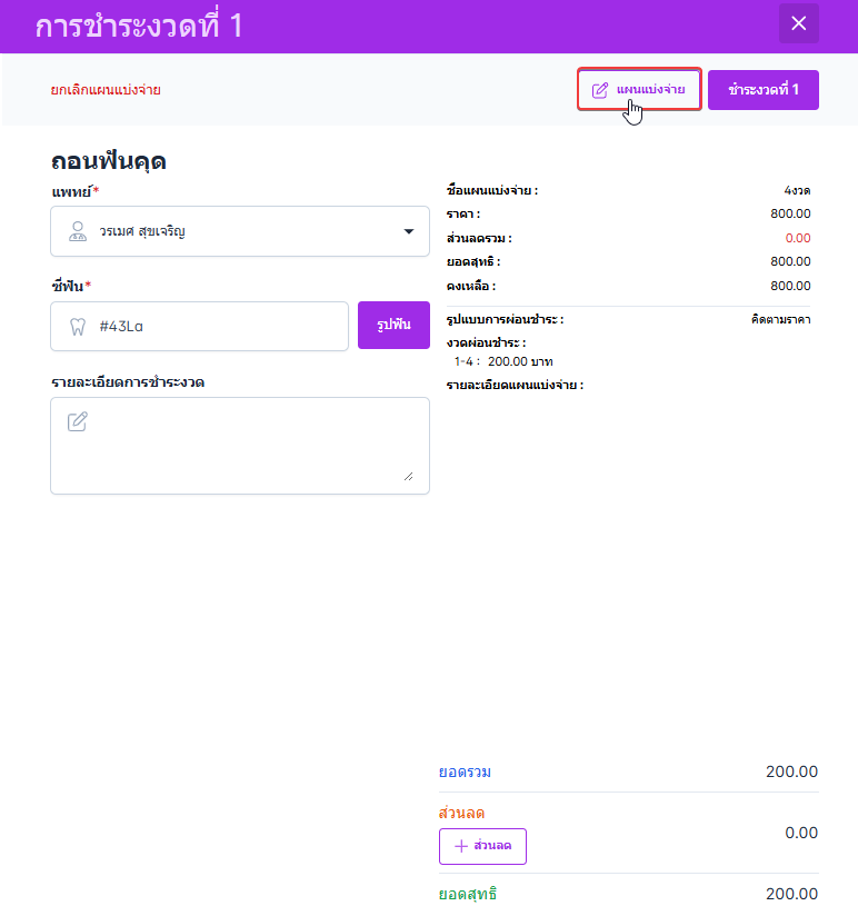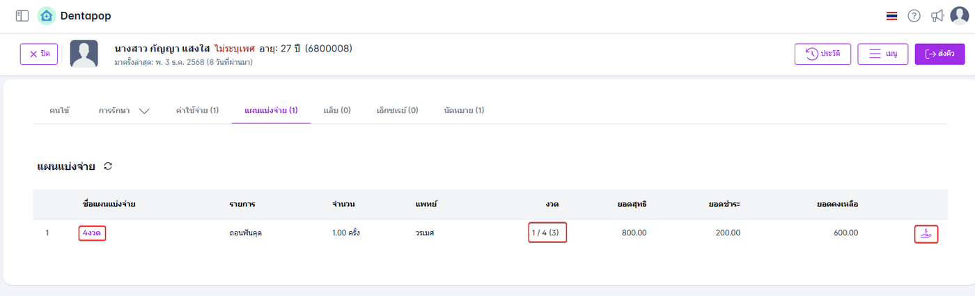 หากคนไข้ชำระภายหลัง แผนแบ่งจ่ายจะอยู่ในแถบแผนแบ่งจ่าย