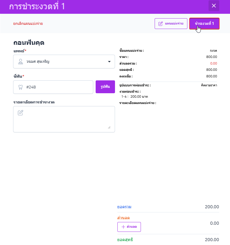 หากคนไข้ต้องการชำระงวดที่ 1 ผู้ใช้งานสามารถคลิก ชำระงวดที่ 1 ซึ่งสามารถชำระงวดอื่นๆได้จนครบงวด