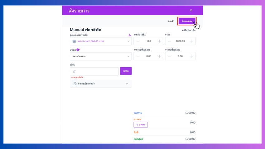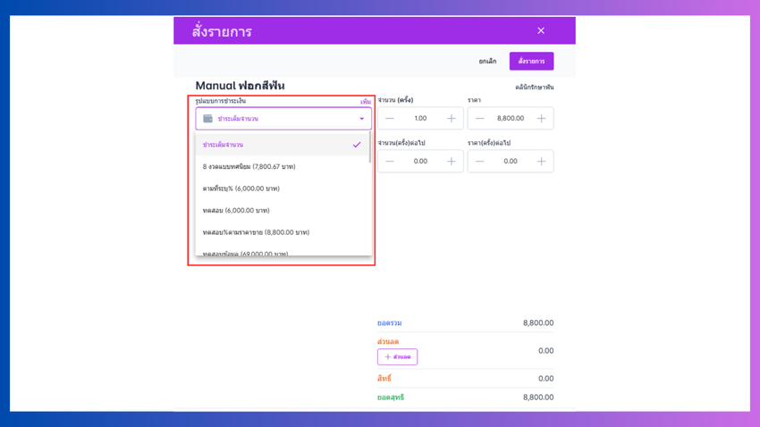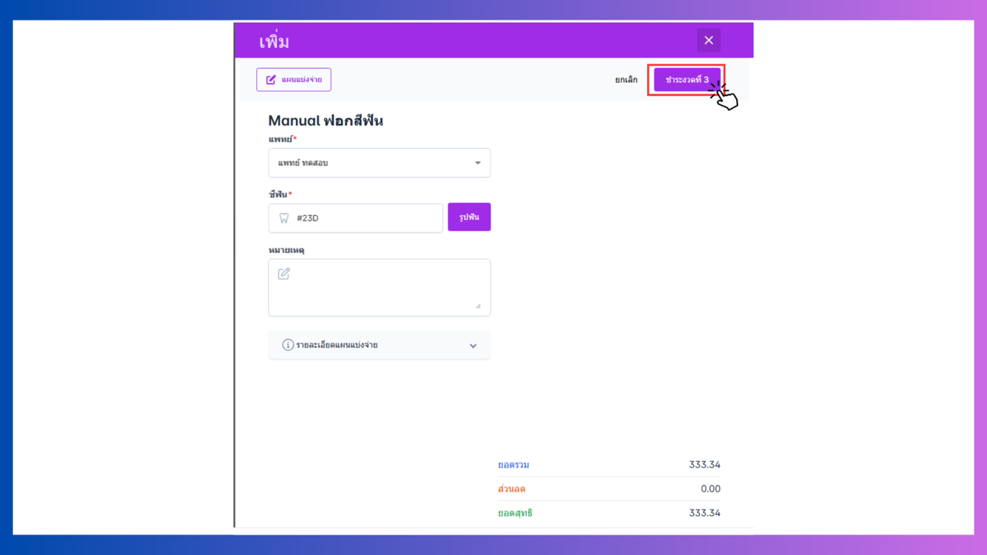 - ส่วนลด : คลิกที่เพิ่มส่วนลด