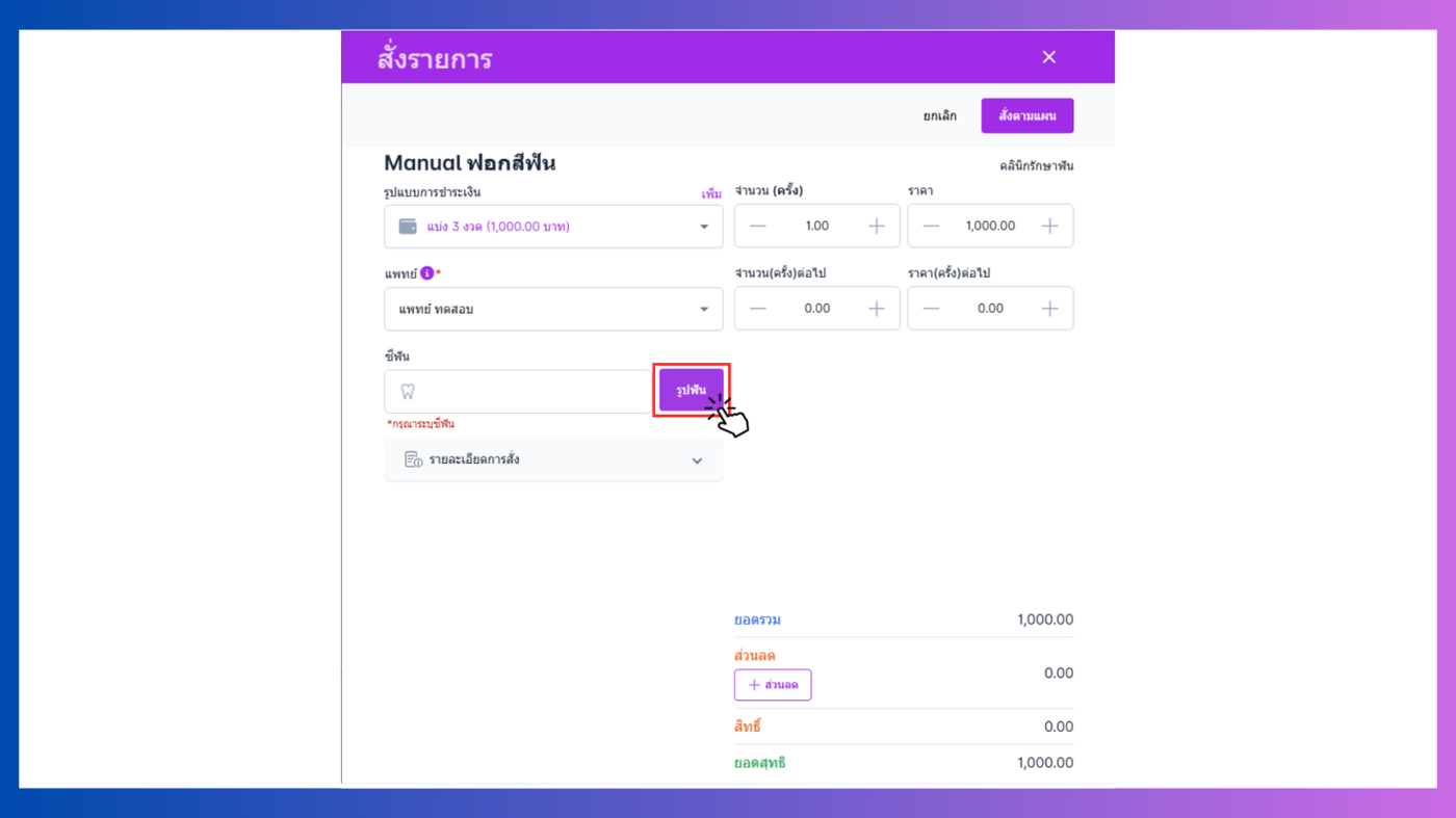 - ผู้ใช้งานสามารถคลิกที่ด้านฟัน ระบบจะระบุด้านฟันในกล่องข้อความ