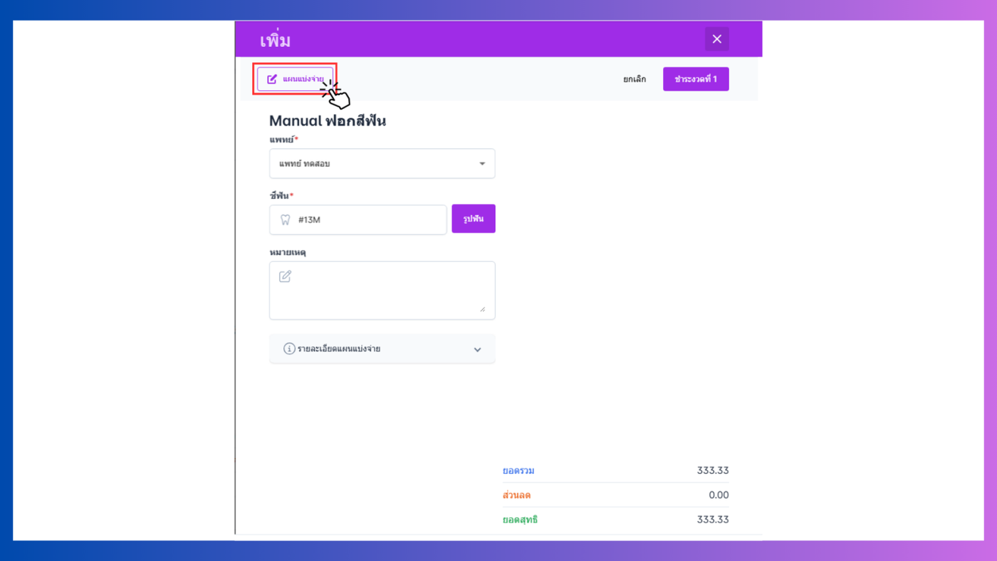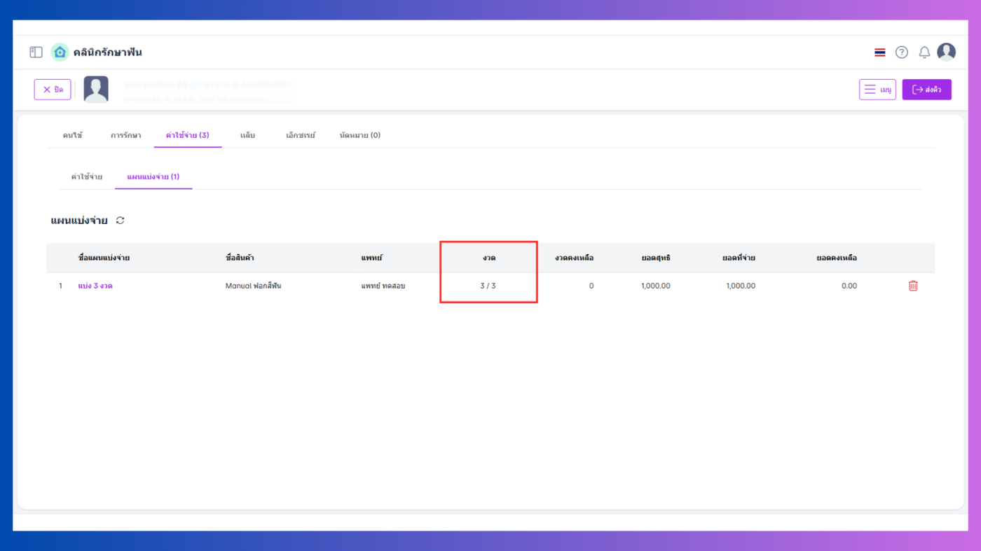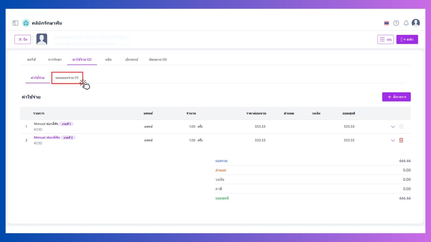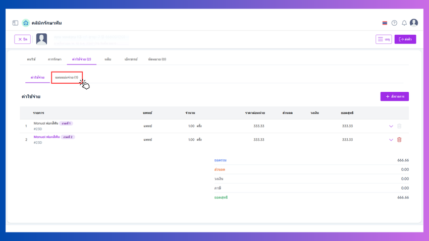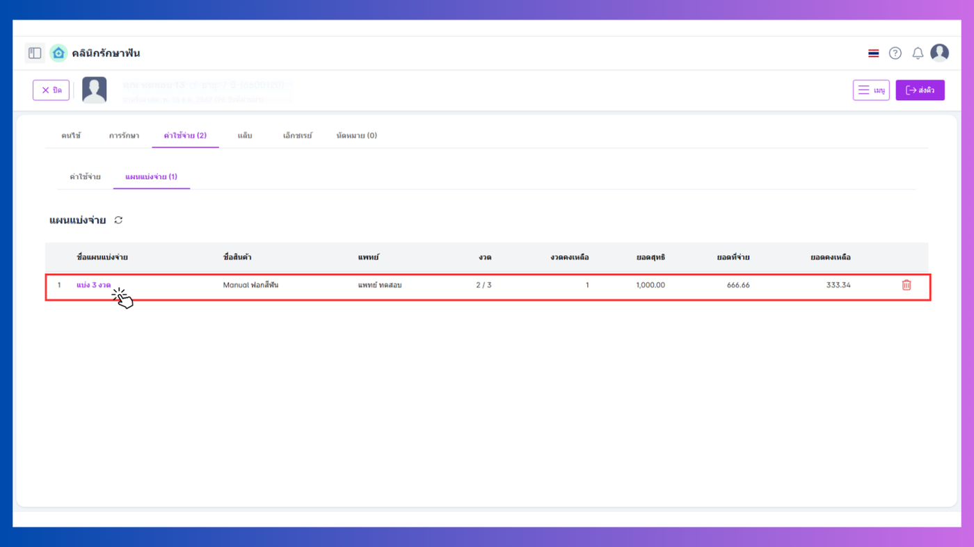 แท็บแผนแบ่งจ่ายสามารถลบรายการได้และชำระโดยคลิกที่ชื่อแผนแบ่งจ่าย