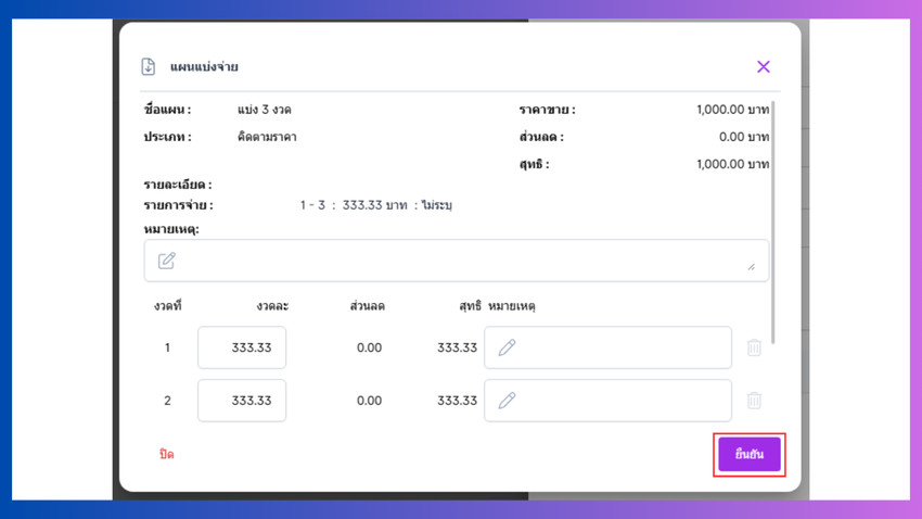 สามารถปรับแผนแบ่งจ่ายได้และลบ งวดที่แบ่งจ่ายได้ ใส่หมายเหตุไก้ และกดยืนยัน