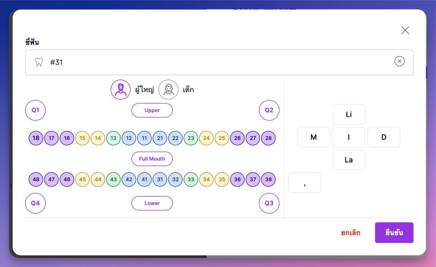 - ซี่ฟัน : คลิกปุ่มรูปฟันเพื่อระบุซี่ฟันของรายการรักษา ระบบจะแสดงหน้าต่างระบุซี่ฟัน
