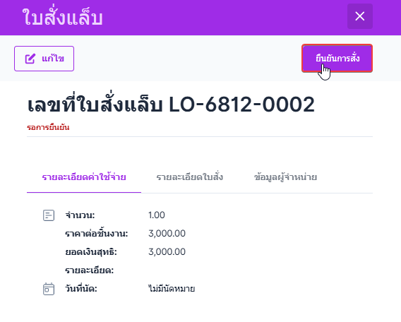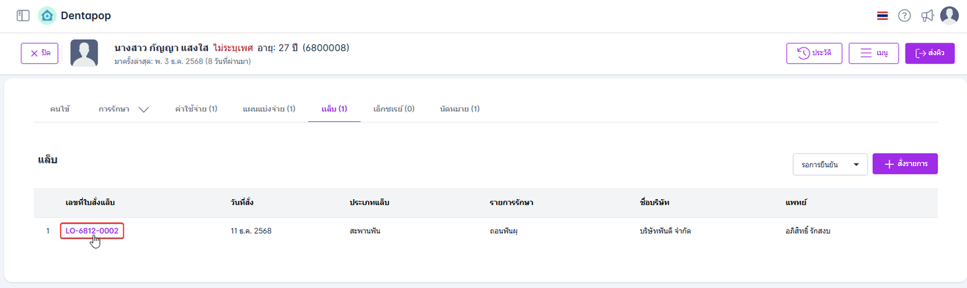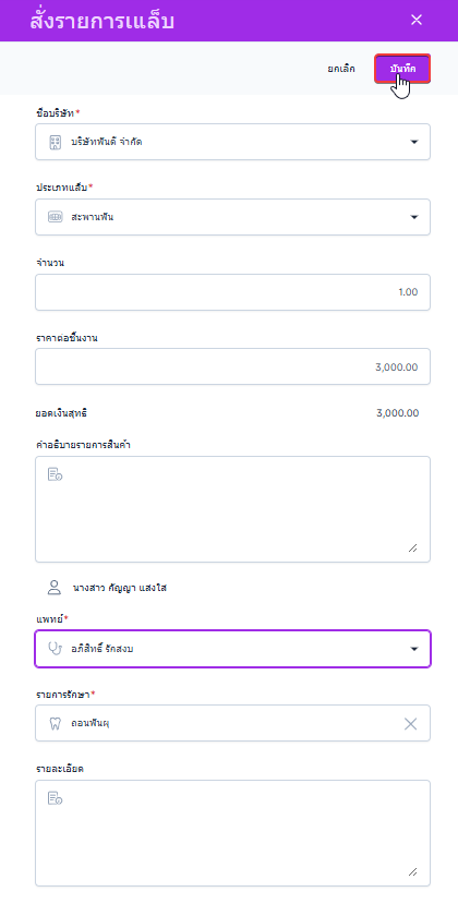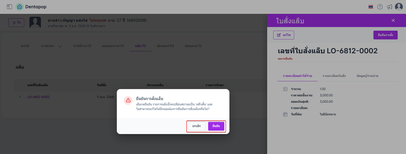 ผู้ใช้งานสามารถคลิก ยืนยัน หรือ ยกเลิก การสั่งแล็บได้ โดยหากผู้ใช้งานคลิก ยืนยัน รายการแล็บจะเปลี่ยนสถานะเป็นเสร็จสิ้นและไม่สามารถแก้ไขได้