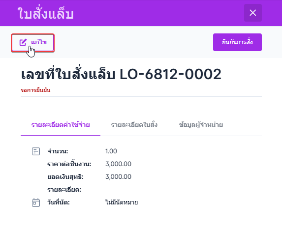 ระบบจะแสดงหน้าต่างข้อมูลใบสั่งแล็บ ผู้ใช้งานคลิก แก้ไข