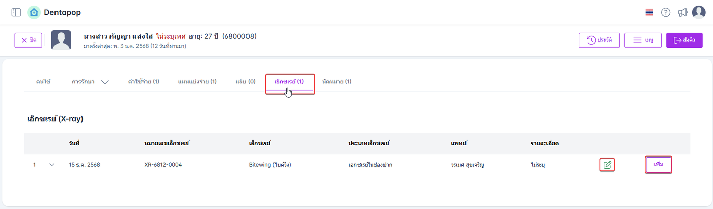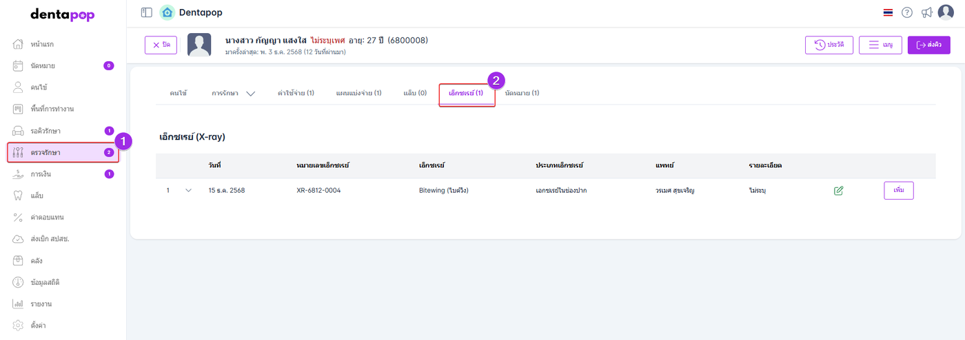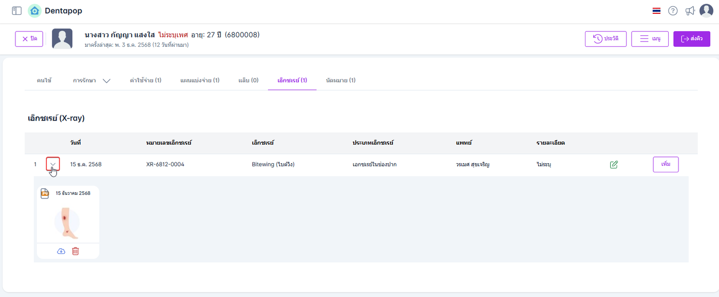 ระบบจะบันทึกรายการเอ็กซเรย์และแสดงในแถบหัวข้อค่าใช้จ่ายและแถบหัวข้อเอ็กซเรย์