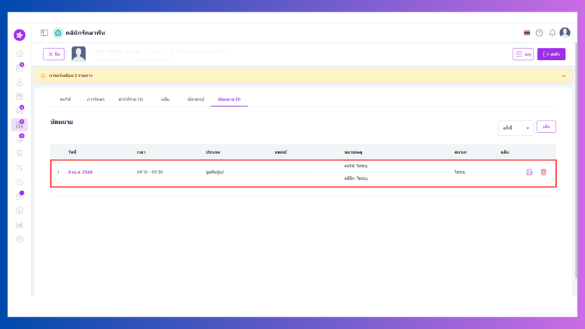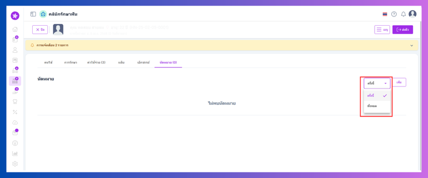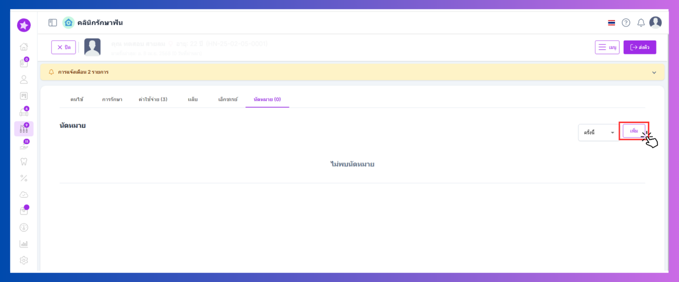- ครั้งนี้ : ระบบจะแสดงรายการนัดหมายที่มีการเพิ่มในการรักษาครั้งนี้