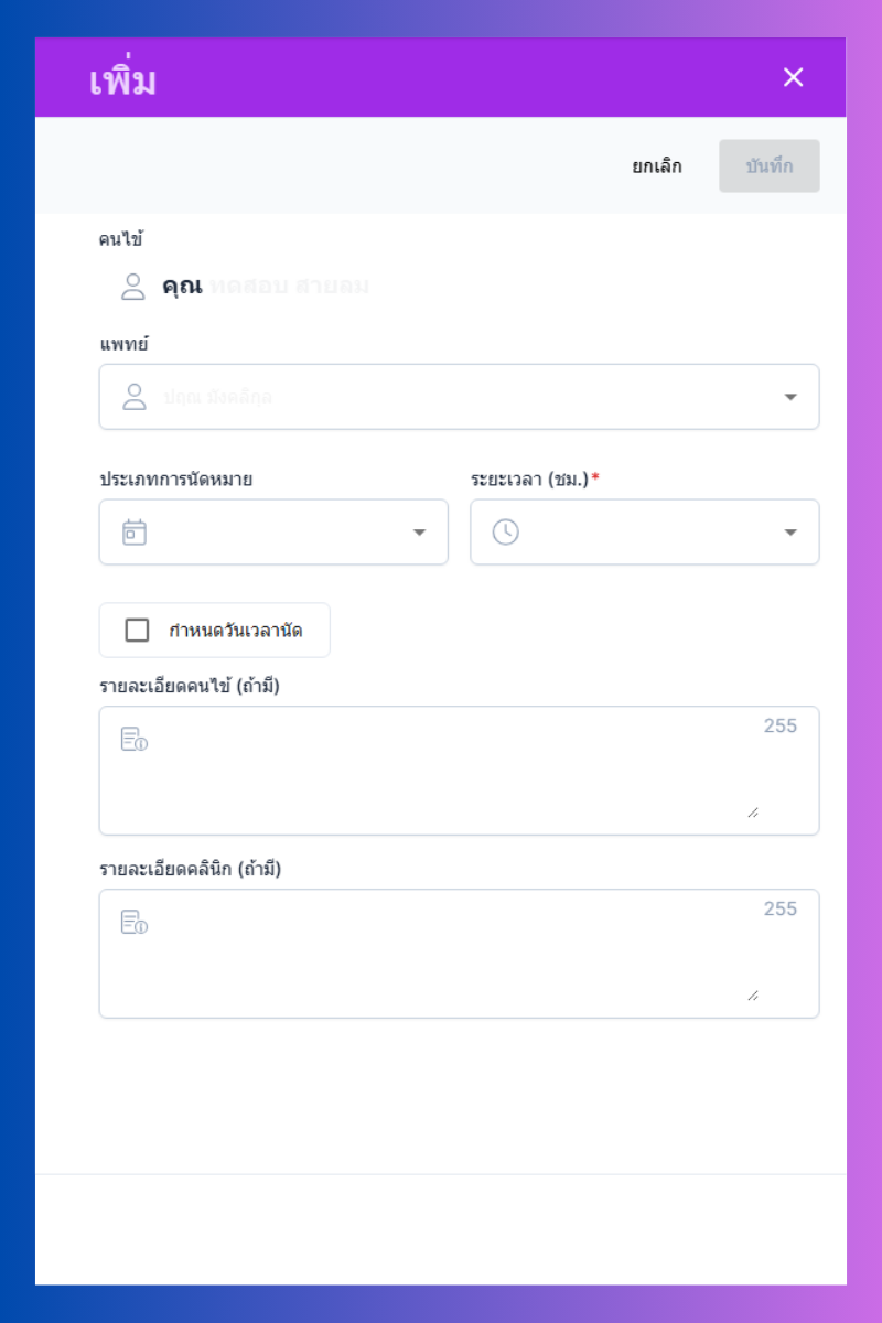 - คลิกที่เพิ่ม ระบบจะแสดงหน้าต่างเพิ่มนัดหมาย