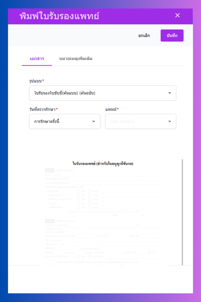 - เลือกแพทย์ : ชื่อแพทย์ที่จะแสดงบนใบรับรองแพทย์