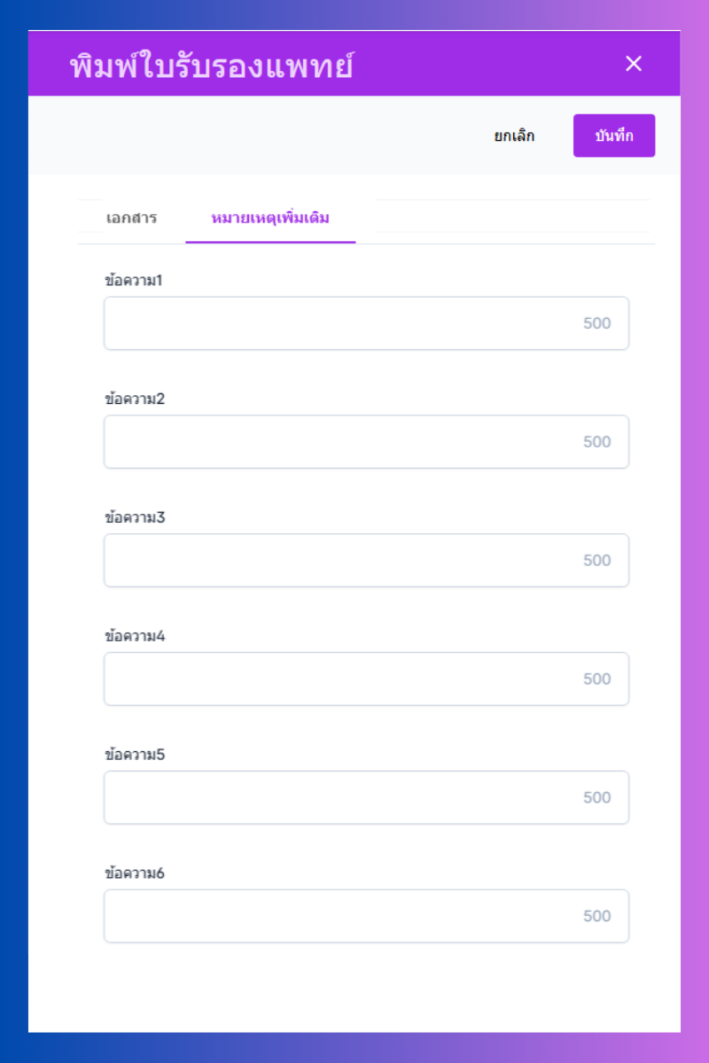 หมายเหตุเพิ่มเติม : ผู้ใช้งานสามารถเขียนข้อความเพิ่มเติมเพื่อแสดงในใบรับรองแพทย์ ได้ 6 ข้อความ