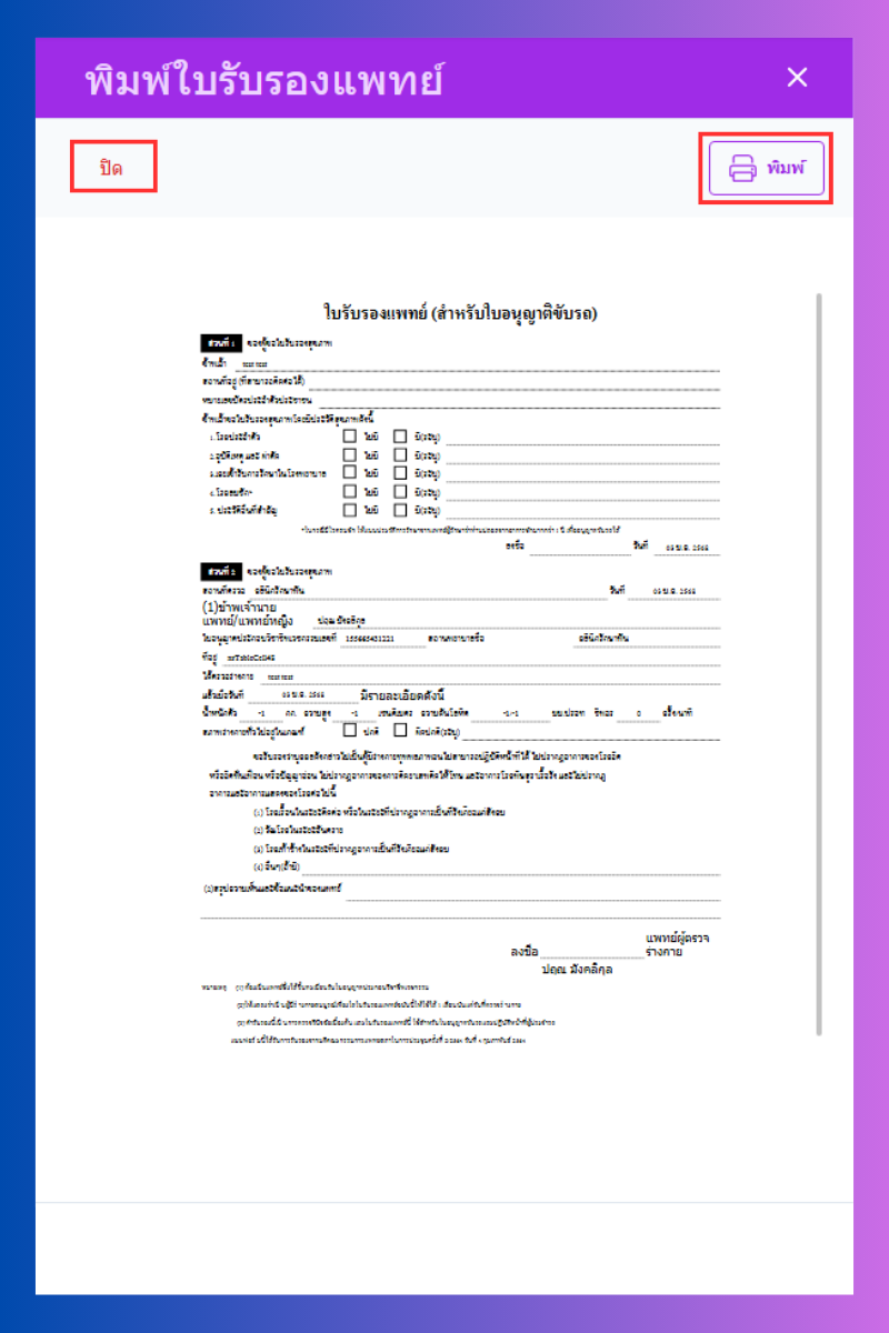 เมื่อกดบันทึกแล้ว ผู้ใช้งานจะสามารถสั่งพิมพ์ใบรับรองแพทย์ได้