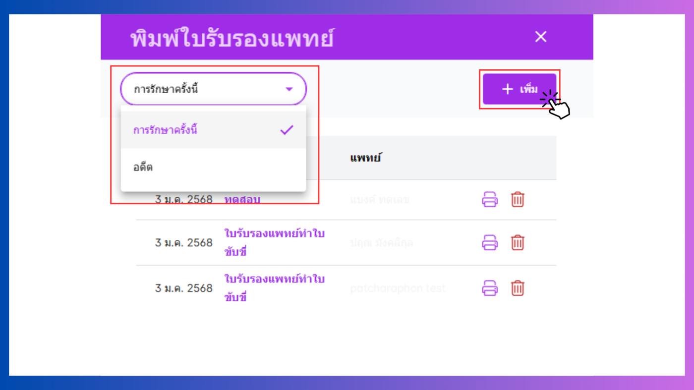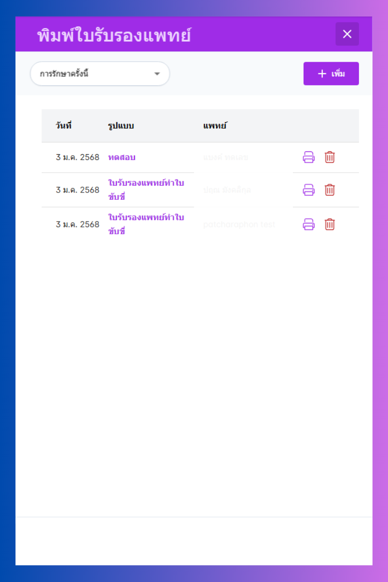 - การรักษาครั้งนี้ : จะแสดงใบรับรองแพทย์ที่ถูกเพิ่มในวันที่เข้ารักษา