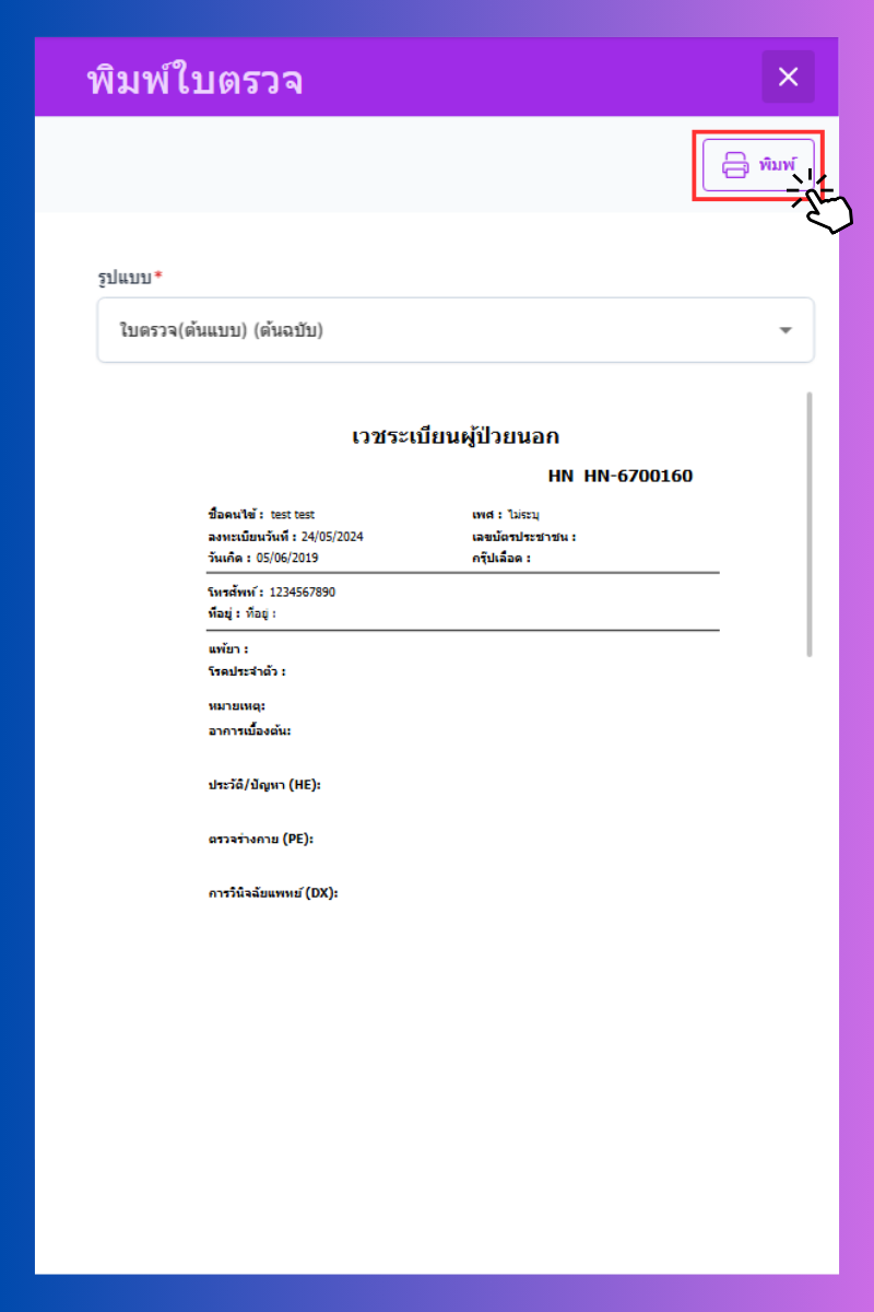 เมื่อผู้ใช้งานเลือกใบตรวจ ระบบจะเข้าสู่หน้าพิมพ์