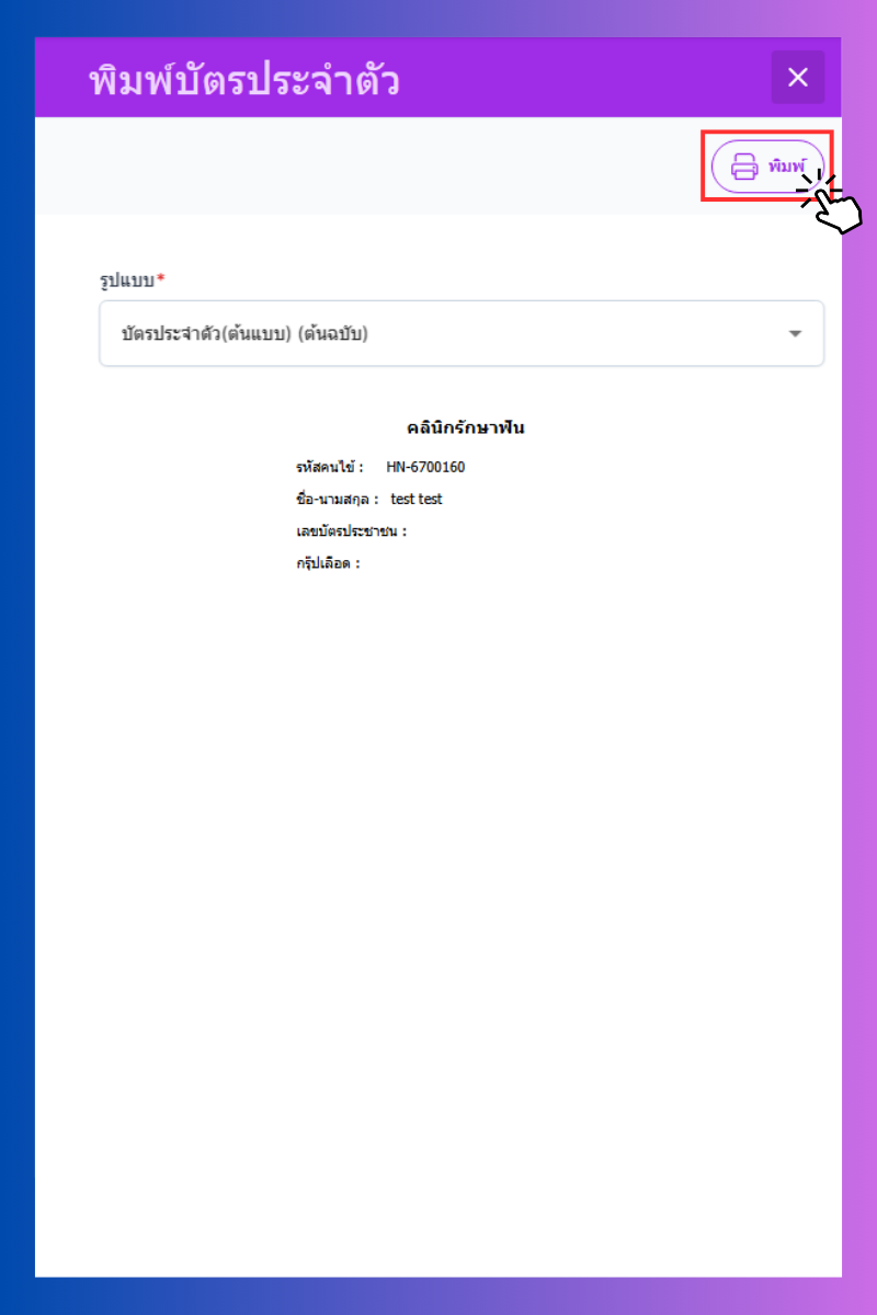 เมื่อผู้ใช้งานเลือกบัตรประจำตัว ระบบจะเข้าสู่หน้าพิมพ์