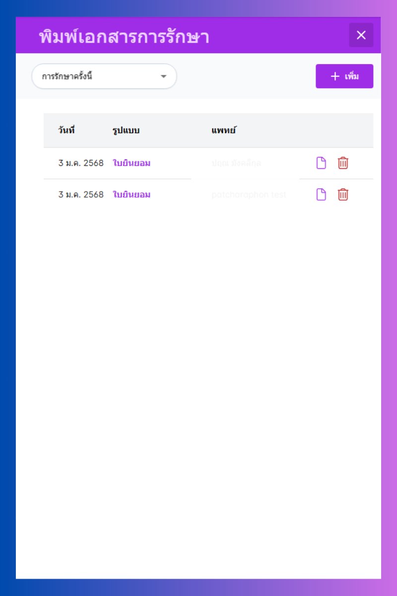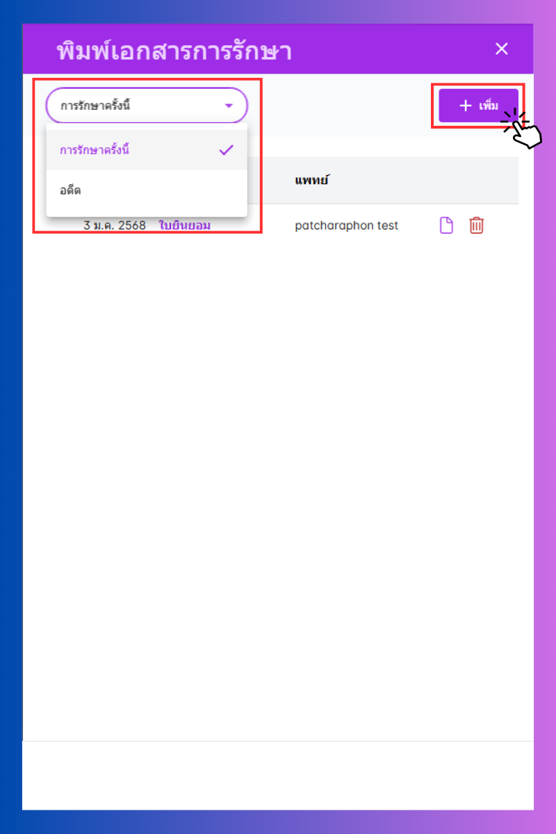 - การรักษาครั้งนี้ : จะแสดงเอกสารการรักษาที่ถูกเพิ่มในวันที่เข้ารักษา
