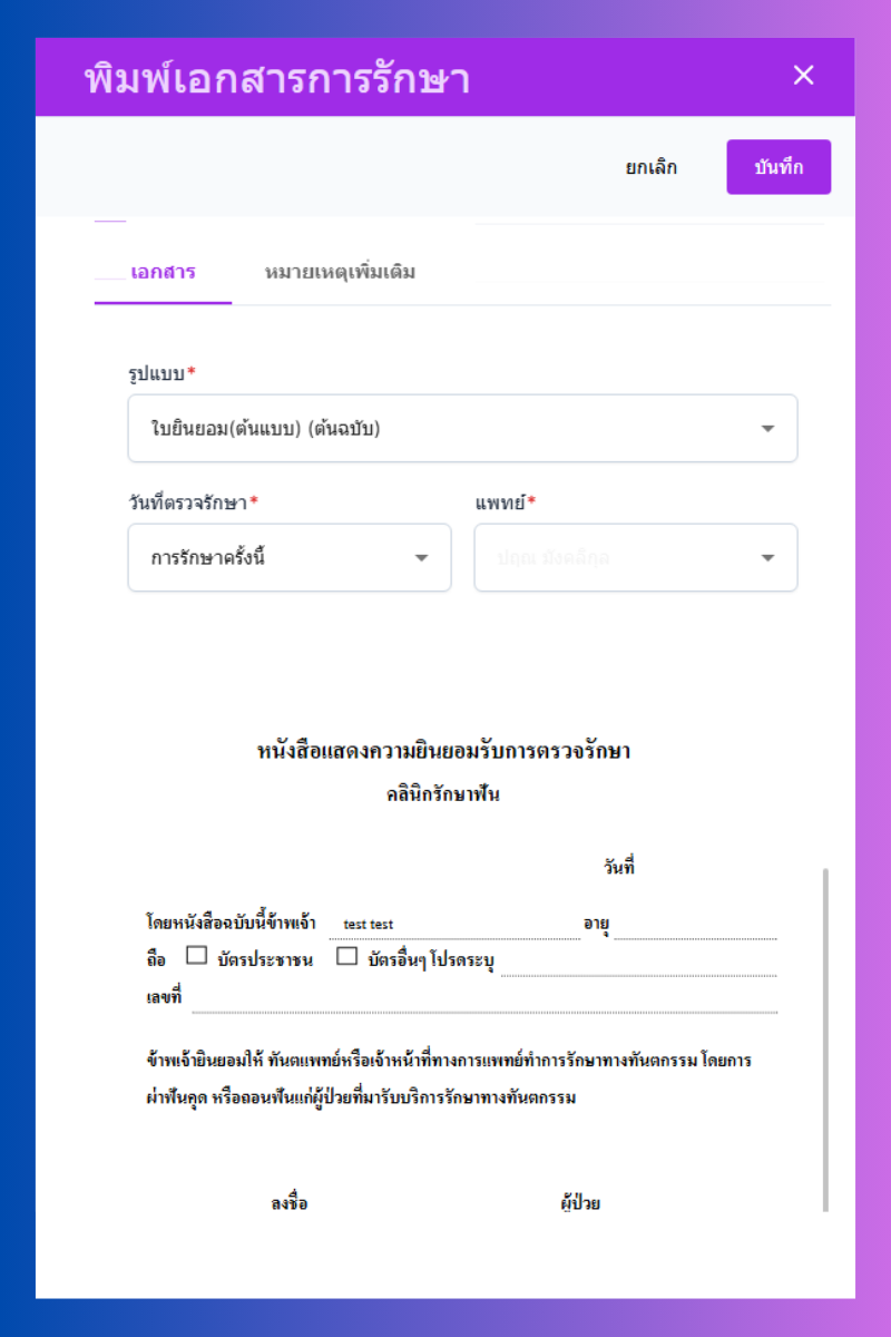 - เลือกแพทย์ : ชื่อแพทย์ที่จะแสดงบนเอกสารการรักษา