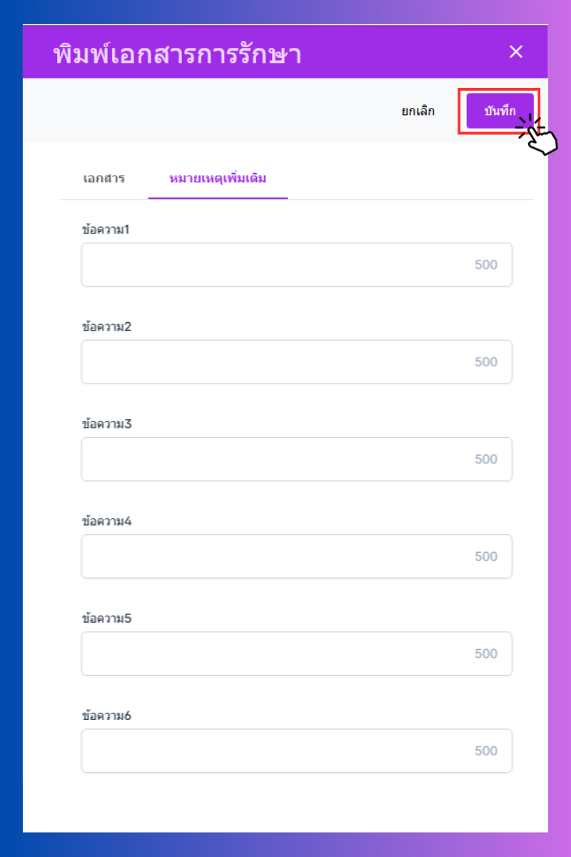 หมายเหตุเพิ่มเติม : ผู้ใช้งานสามารถเขียนข้อความเพิ่มเติมเพื่อแสดงในเอกสารการรักษา ได้ 6 ข้อความ