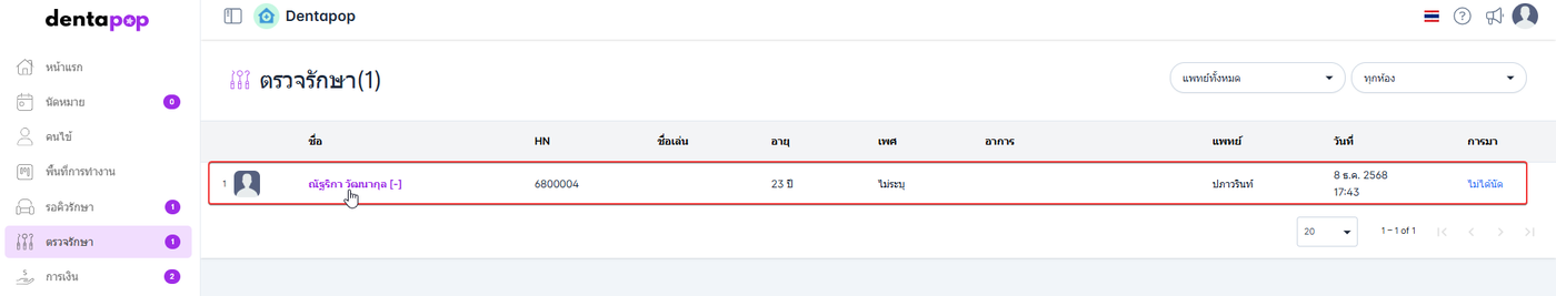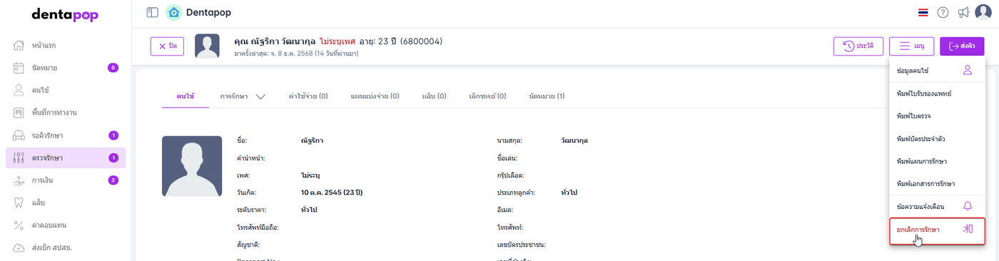 ผู้ใช้งานเลือกคนไข้ที่ต้องการยกเลิกการรักษาและคลิกที่ชื่อคนไข้