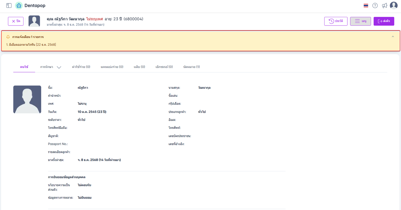 เมื่อผู้ใช้งานทำการเพิ่มข้อความแจ้งเตือนของคนไข้แล้ว ระบบจะแสดงข้อความแจ้งเตือนทุกครั้งเมื่อมีการเข้ามาที่คนไข้ที่เพิ่มข้อความแจ้งเตือนไว้