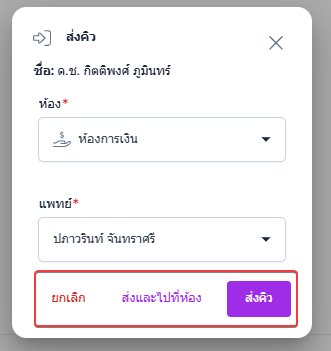 เมื่อผู้ใช้งานระบุข้อมูลเรียบร้อย ผู้ใช้งานสามารถคลิก ส่งคิว ส่งและไปที่ห้อง หรือ ยกเลิก
