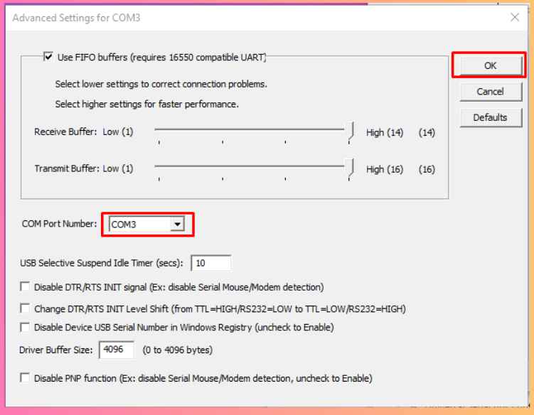 4.จากนั้นเปลื่ยนตรง COM Port Number เป็น COM3 > จากนั้นกด OK แล้วลองใช้งานลิ้นชักครับ