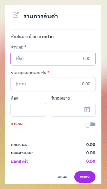 เมื่อเลือกสินค้า ระบบจะแสดงหน้าต่างให้ผู้ใช้ระบุจำนวน และ ราคาทุนต่อหน่วย : ชิ้น ล็อต วันหมดอายุ สามารถปรับส่วนลดได้