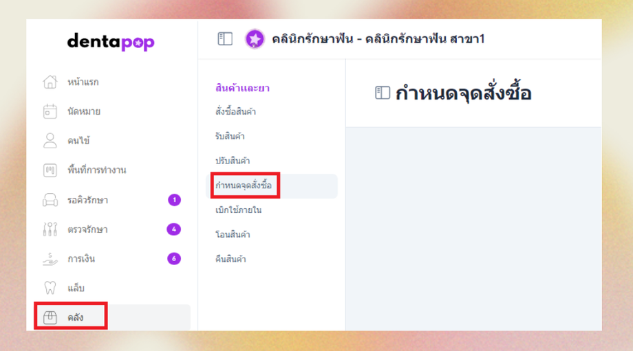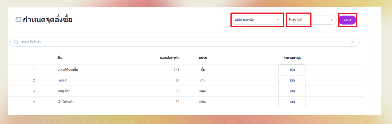 2.เลือกหัวข้อสินค้าและยา > กำหนดจุดสั่งซื้อ
